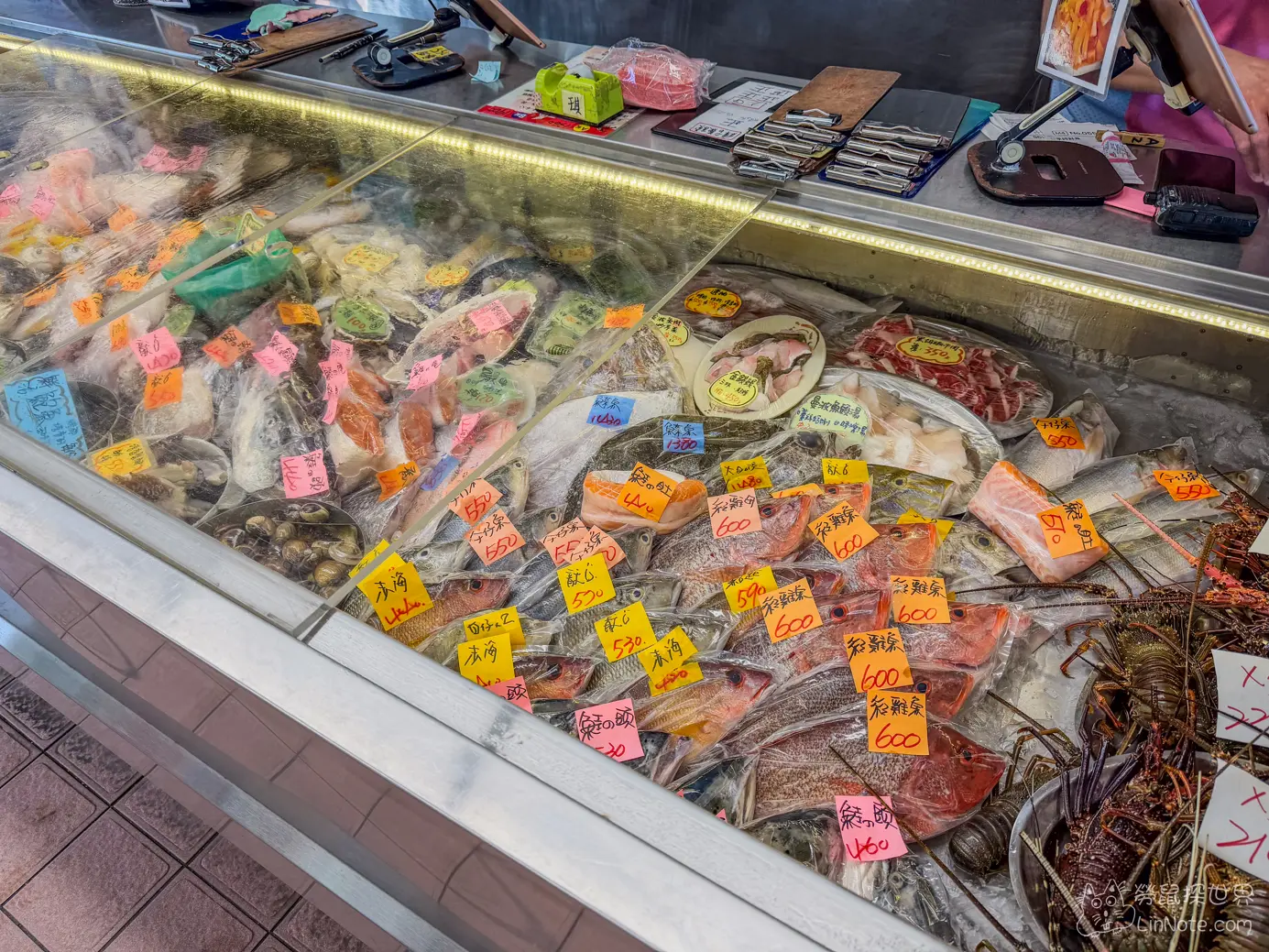 除了擺在冰櫃的海鮮外,這裡還有活海鮮,每一樣都有清楚標價,若想品嘗高級食材,也可直接挑選水池中的新鮮漁獲。