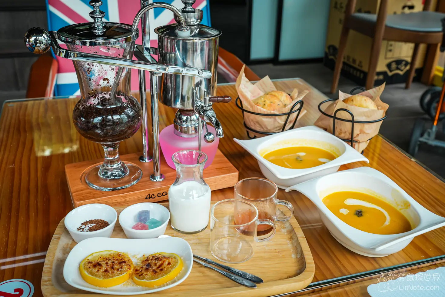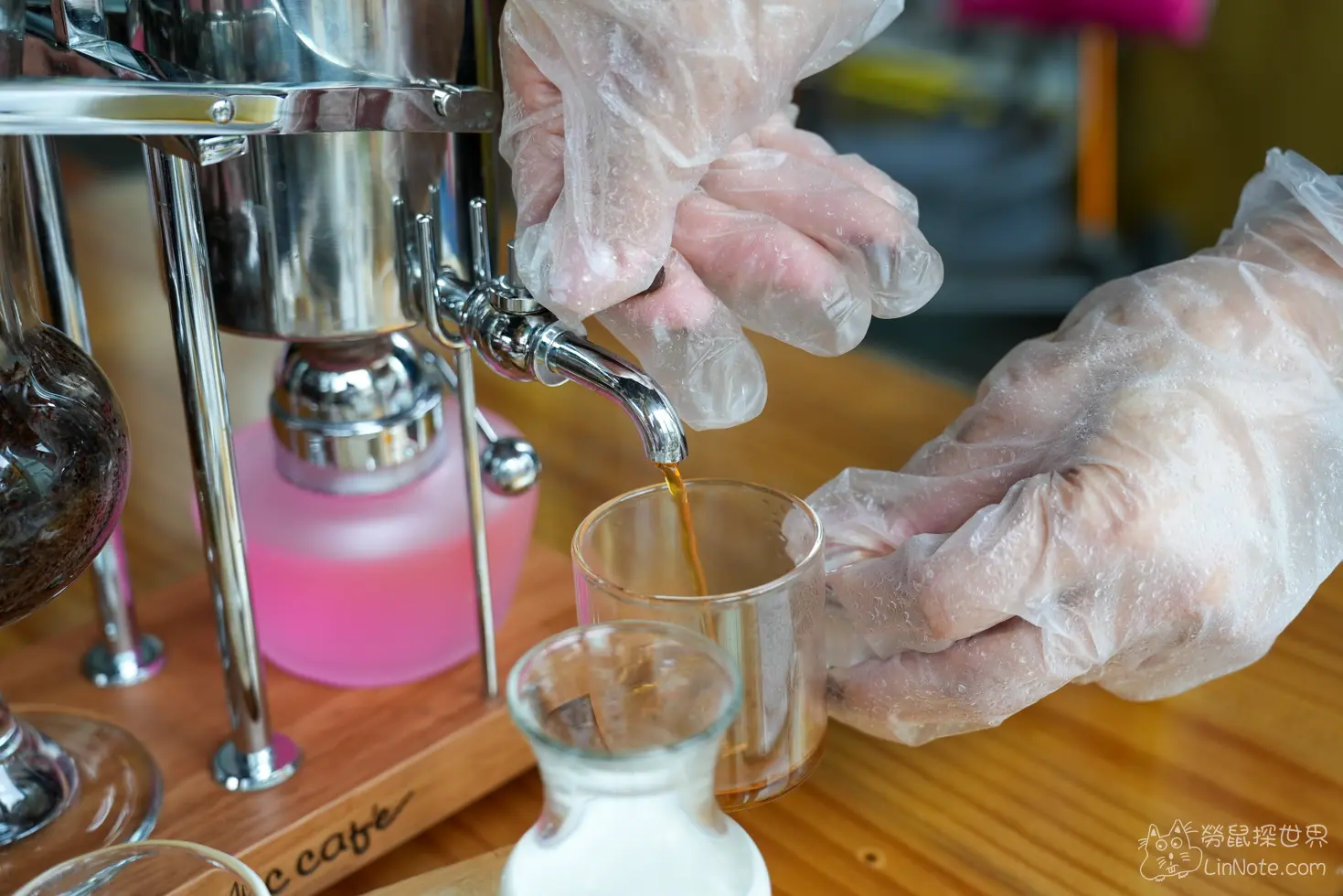 比利時咖啡是用虹吸式的器具承裝,一開始上菜的時候,咖啡壺還在沸騰,等到完全煮沸之後,店員會把火關掉,這時候咖啡就會從玻璃罐吸到鐵罐中,之後轉開開關就可以喝了,比利時咖啡上還附贈檸檬糖片跟琥珀糖可以搭著一起吃。