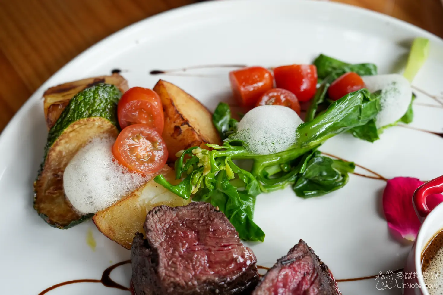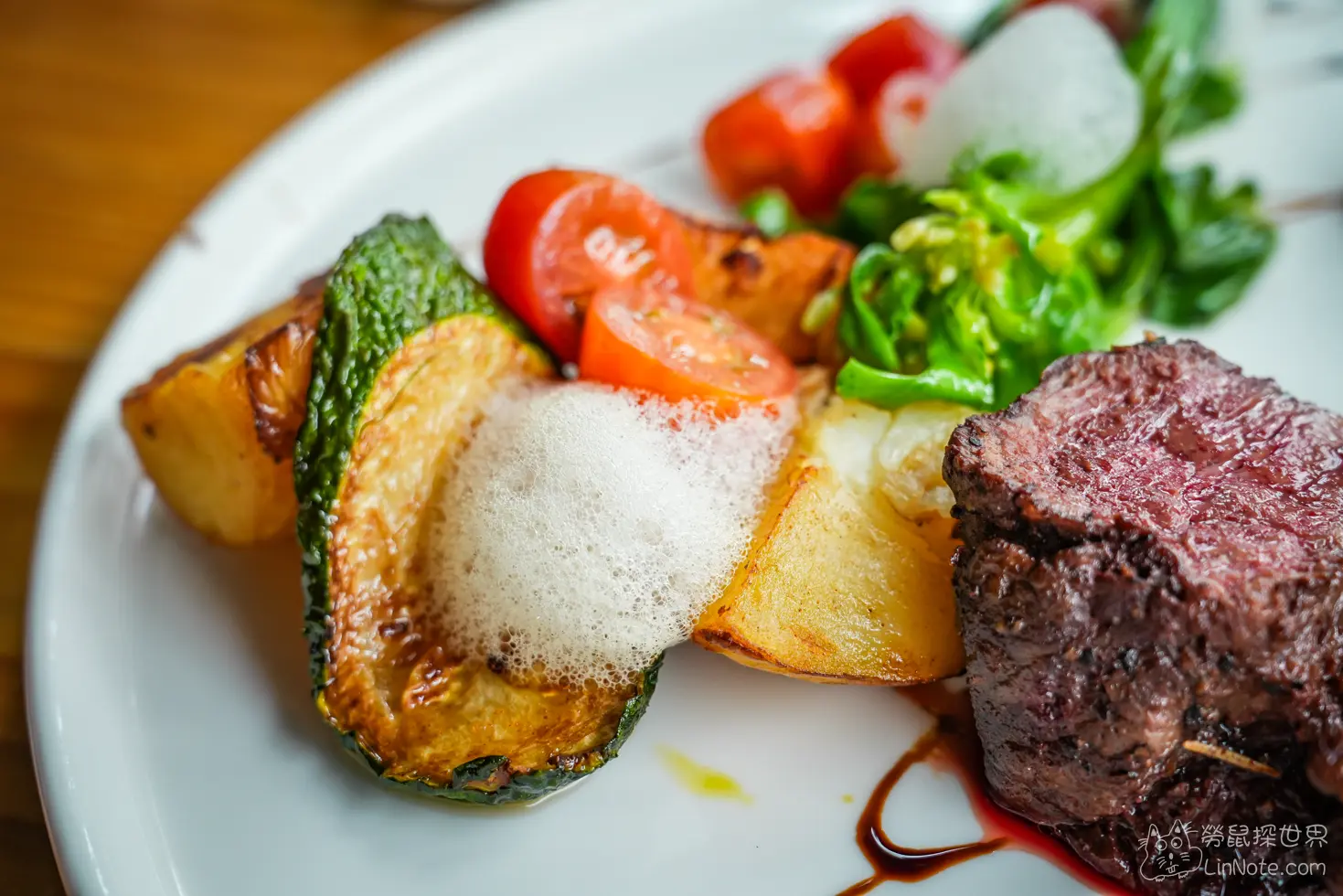 一旁的配菜應該是經過爐烤,每一樣都有烤炙過的香味,而且蔬菜的水分都有保留,上面並沒有特別調味,只有簡單的橄欖油,簡單但並不失美味。