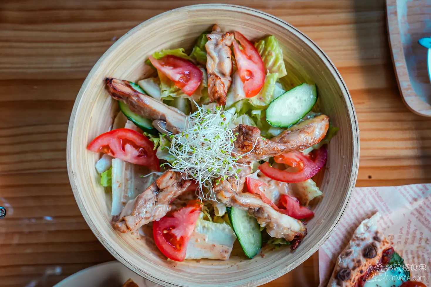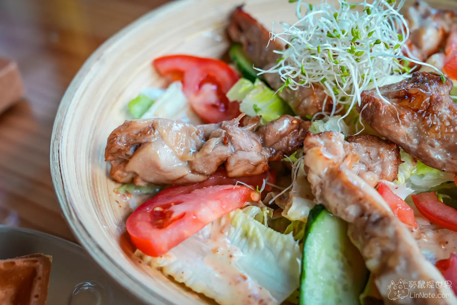香烤雞肉和風芝麻沙拉的雞肉是選用雞腿肉,雞腿肉充滿醃料香,外皮酥酥脆脆的,肉非常多汁。
