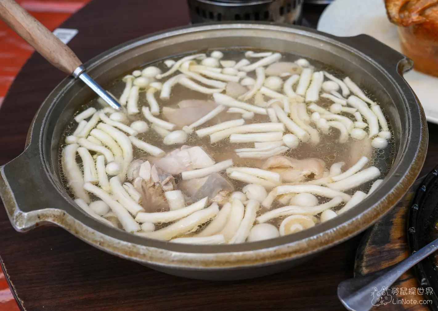 我們點了蒜頭雞湯,不過一上桌的時候,我們以為店家送錯湯了,因為上面滿滿的白精靈菇,沒想到一喝下去才知道這就是妥妥的蒜頭雞湯,雞湯中充滿蒜頭香,而且還帶有淡淡的白雞靈菇的香氣,想不到蒜頭跟白精靈菇那麼契合,真的太好喝了。