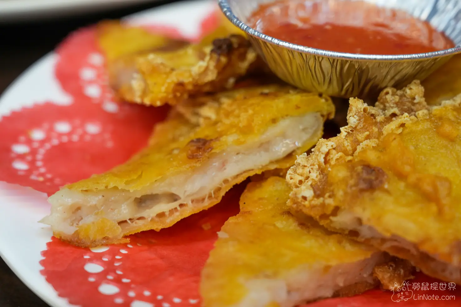月亮蝦餅的外皮炸得金黃酥脆,咬下去真的會有「喀滋」的聲響,內餡非常真材實料,每一口都咬得到蝦肉,而且蝦肉的鮮甜會在口中蔓延。