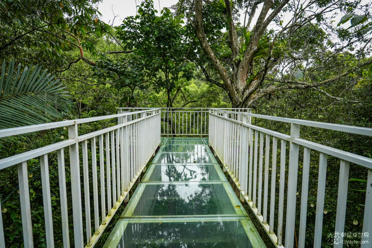 這裡還有一條玻璃棧道,透過腳下的透明玻璃,可以清晰地看到下面鬱鬱蔥蔥的森林。四周環繞着參天大樹,彷彿進入了一個綠意盎然的夢幻世界。微風拂過,樹葉在空中輕輕舞動,帶來陣陣清新的氣息。