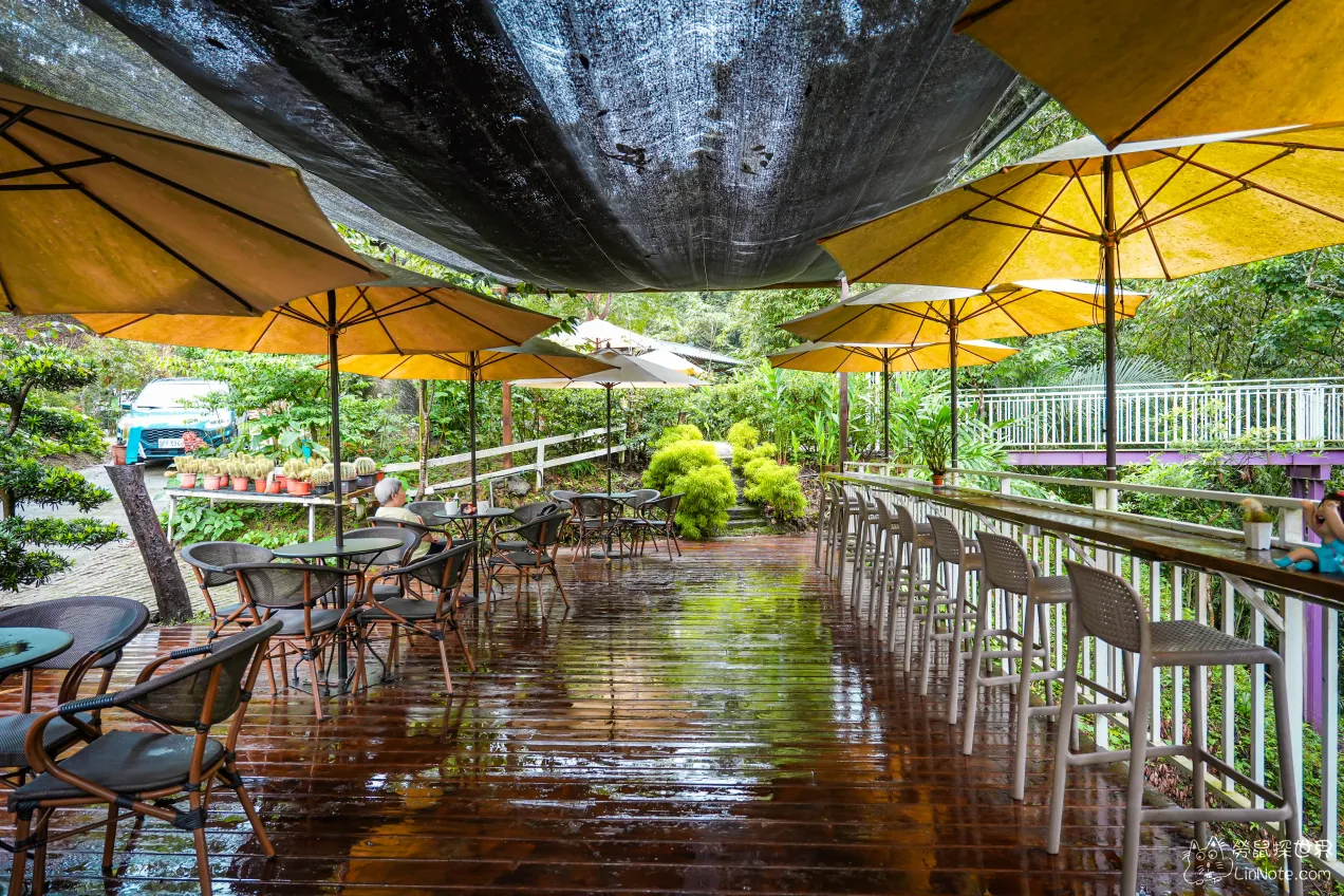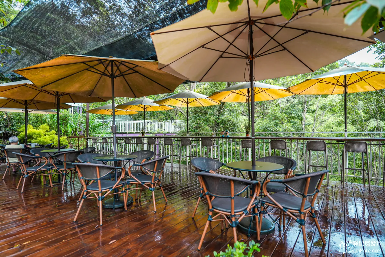 藍月山谷的用餐區域只有室外露台,露臺上整齊地擺放著藤編的椅子和小桌子,黃色的大傘懸掛在上方,為每位客人提供舒適的遮蔽。在陽光不強烈的午後很適合前來吹著和煦的微風。
