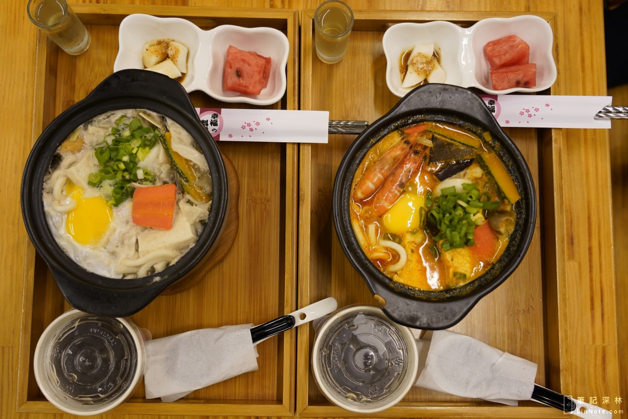 「原味湯底黑豚腰內烏龍麵」則以白湯為主,搭配軟嫩的豬肉片,同樣料多實在且健康。配餐附茶米茶、小菜、甜品紅豆湯,簡單卻精緻。