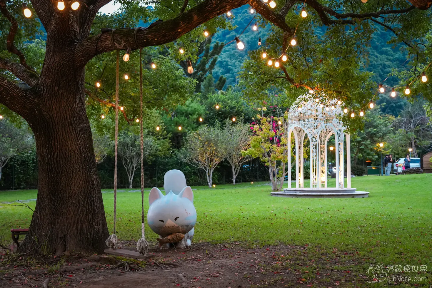 天色越來越暗更能感覺到這裡的美,隨著夕陽慢慢隱去,雲朵花園的燈光逐漸點亮,溫暖的燈火輕輕映照在白色露營車上,像是為這片寧靜的角落披上了一層柔和的光紗。