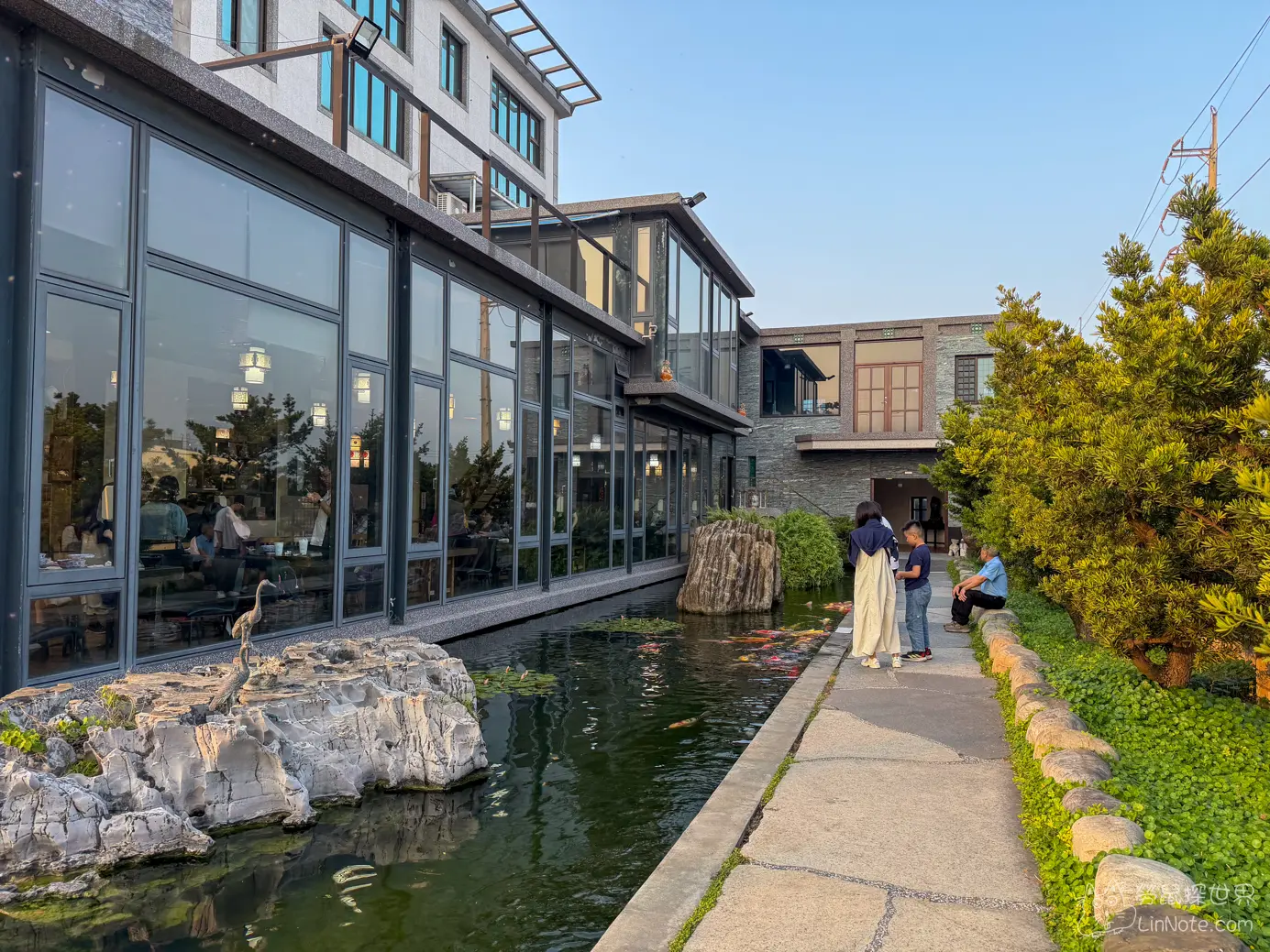 整棟建築採用玻璃屋設計,矗立在水池中央,池裡種滿了荷花,還有成群肥美的錦鯉游來游去。庭院佈置了石雕與假山,充滿了中式古典的禪意,大門口高掛著紅燈籠,還沒進屋就忍不住先拍了好幾張照片。