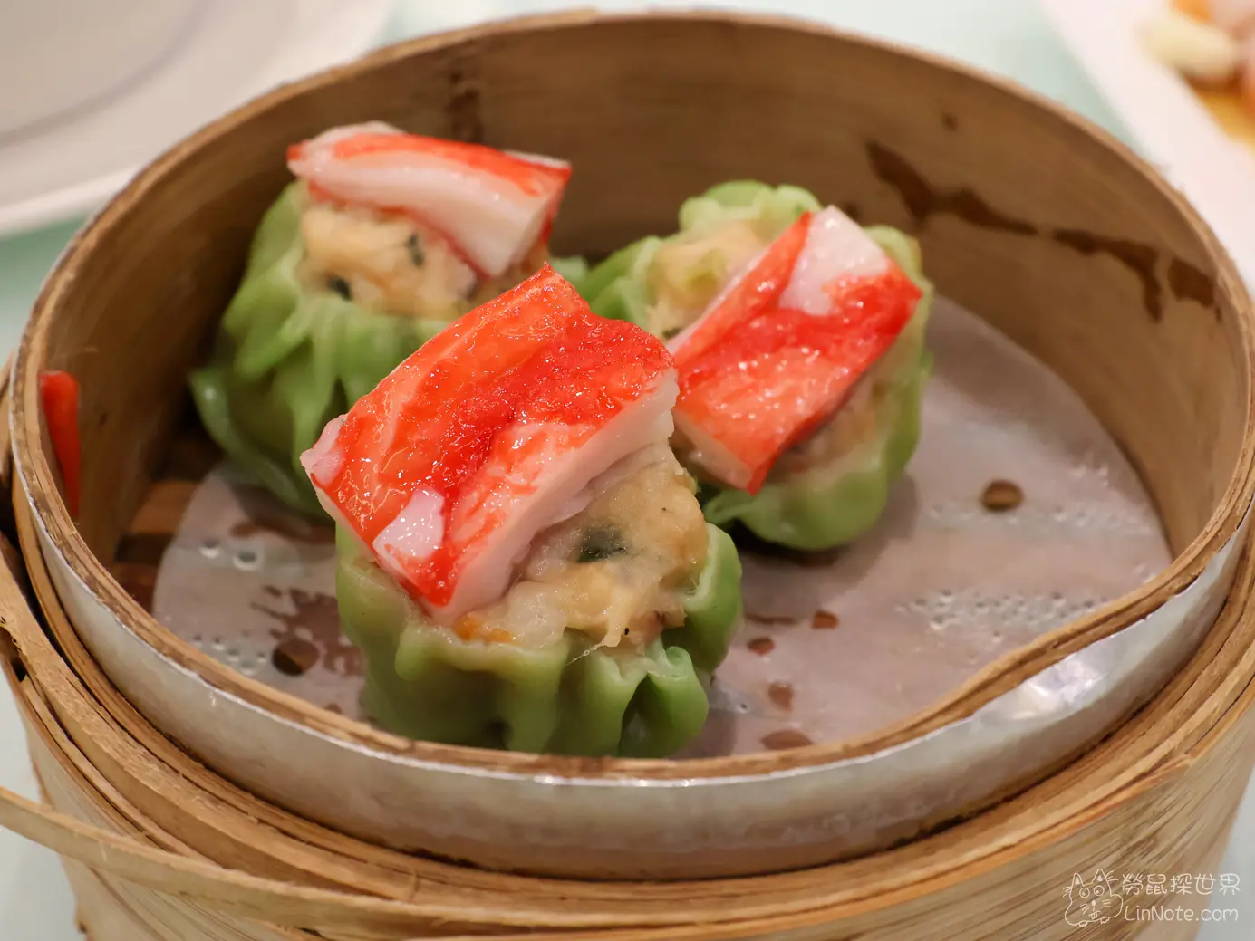 松葉蟹燒賣上面的「松葉蟹」其實比較像是蟹肉棒,實際上吃不太出松葉蟹的風味,但下面的餡料中間有包裹一塊蝦子,整體調味適中,算是一道還不錯吃的精緻燒賣。