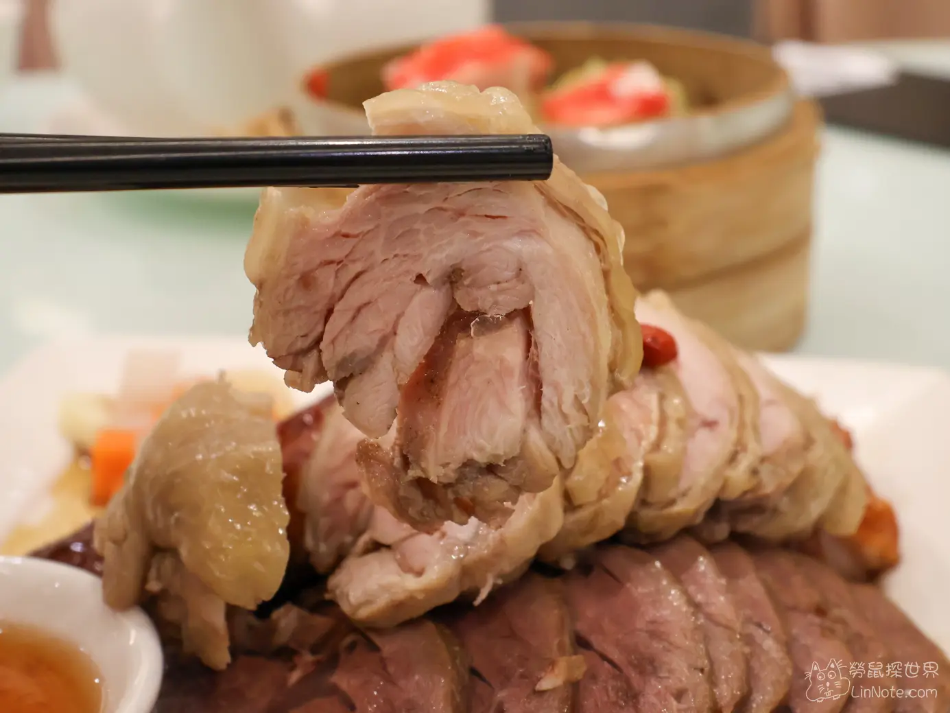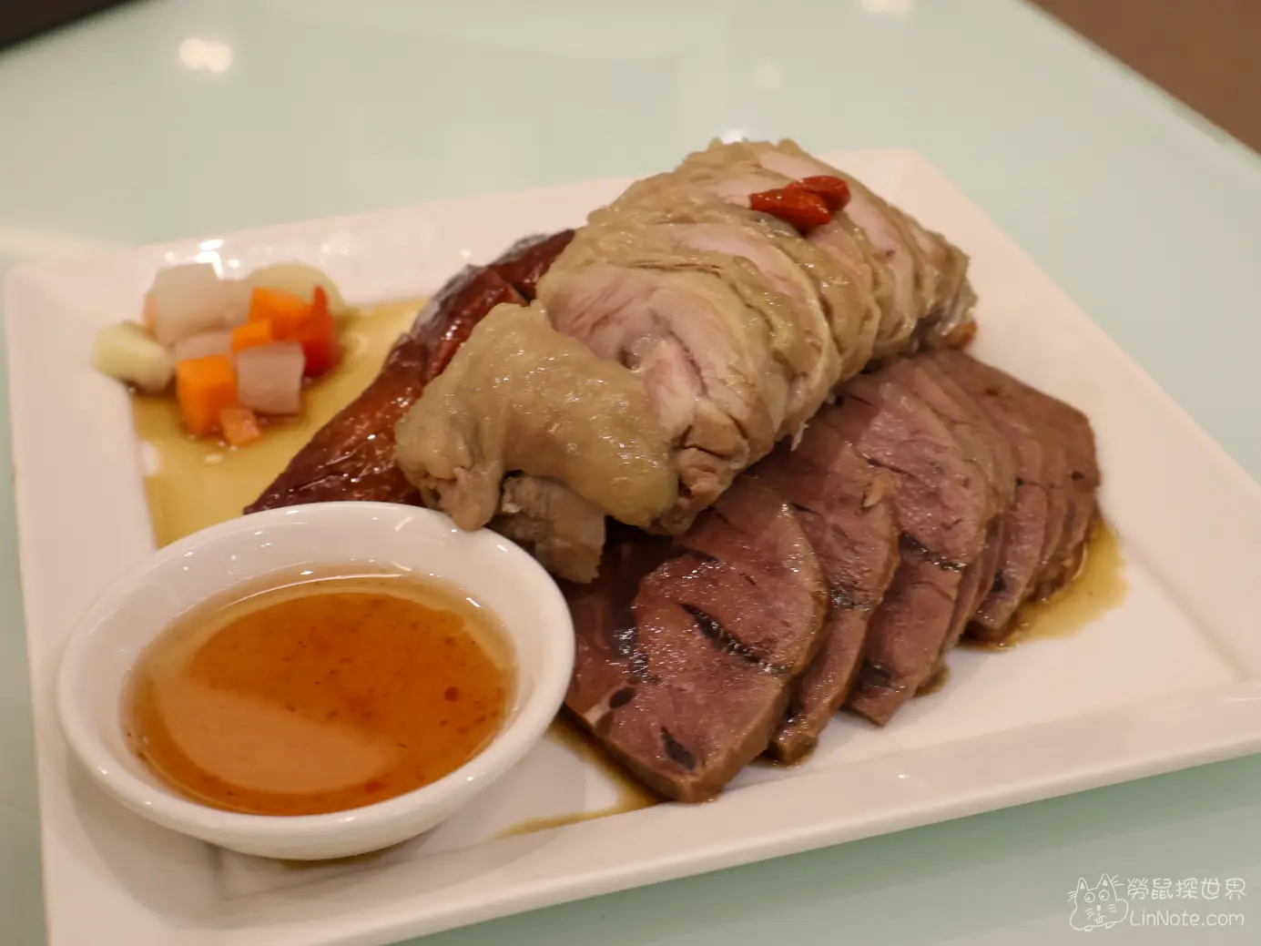 什錦三拼盤可以自行選擇想拼的食材,我們選了滷牛肉、醉雞與烤鴨。不過必須老實說,這道我個人不太喜歡。滷牛肉雖然入味,但肉質偏硬,且味道偏淡,很容易吃到一旁醉雞的酒味。蔘梞醉香雞的酒味非常濃郁,真的是一口下去滿嘴酒香,可惜雞肉本身也偏乾硬,吃不到雞肉原有的甜味。至於烤鴨表現算中規中矩,皮還蠻脆的,肉質雖然有一點點難咬,但水準大概有外面連鎖燒臘店的等級。
