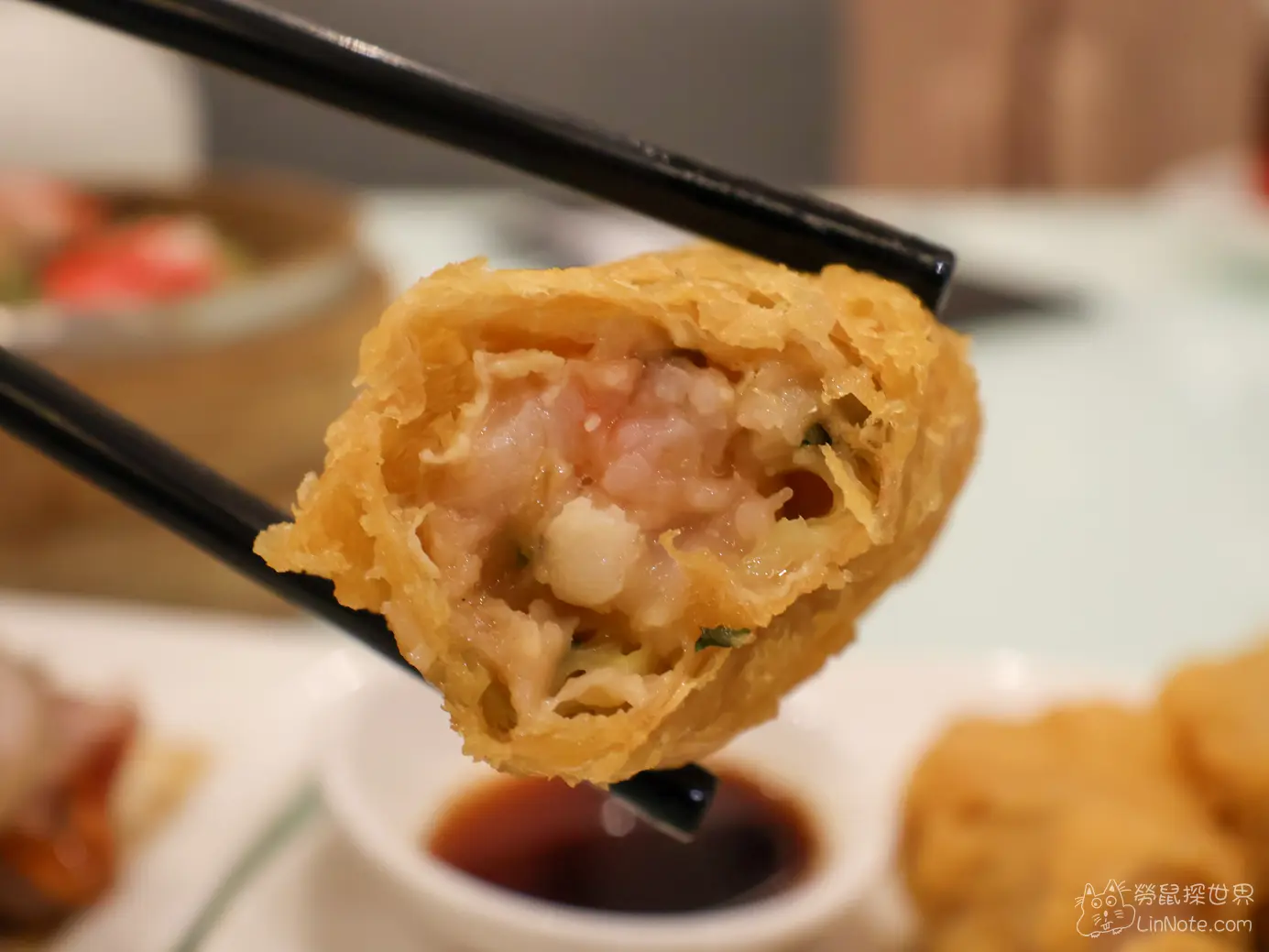鮮蝦腐皮卷真的是經典,外皮炸得極其酥脆,內餡帶著淡淡的韭黃香,咬開來能感受到蝦子的脆感。搭配的沾醬偏向烏醋的味道,酸爽解膩。