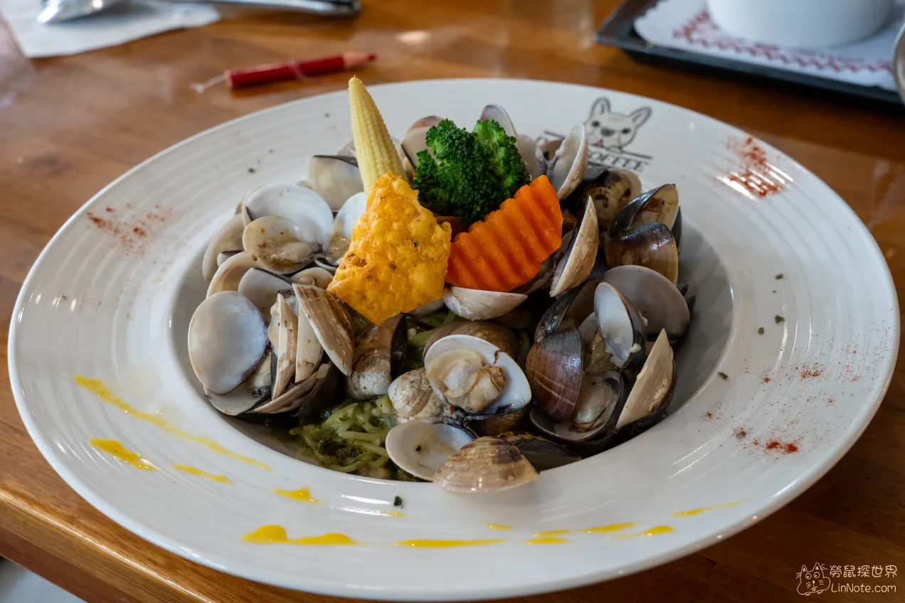 這裡的蛤蠣很多的麵的蛤蜊真的很多,滿滿的一盤都快看不見下面的麵了,蛤蜊都很新鮮,個頭偏中小,重點是下面的青醬很夠味,吃得出真材實料,滿滿的羅勒香,應該是店家自煮的。