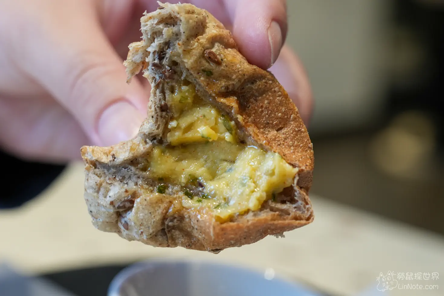 核桃麵包真的非常香非常好吃,小小一塊麵包卻有很很多核桃塊在麵包裡面,一定要趁熱馬上把麵包給吃掉,尤其還要加上旁邊附的大蒜醬,抹在麵包上會更香。