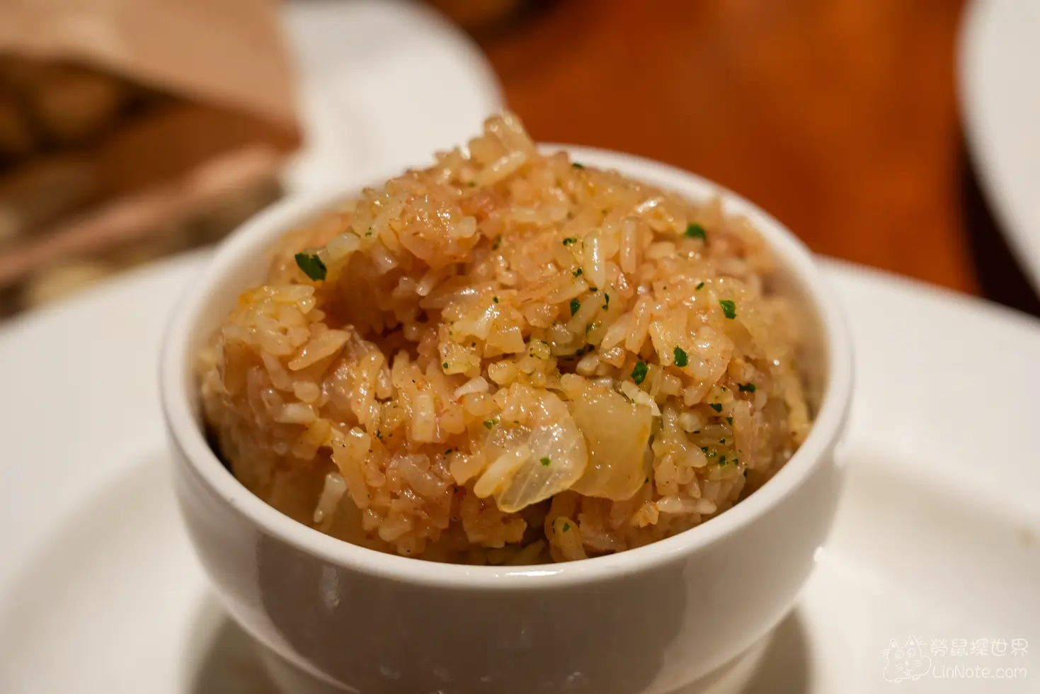 風味飯吃起來有點像是有加了蝦味,或是某種海鮮高湯的味道,帶有辛香料和大蒜的香氣,味道很不錯。不過米粒口感偏硬,不是台灣人習慣的那種軟Q米飯,比較像道地的西式燉飯口感。