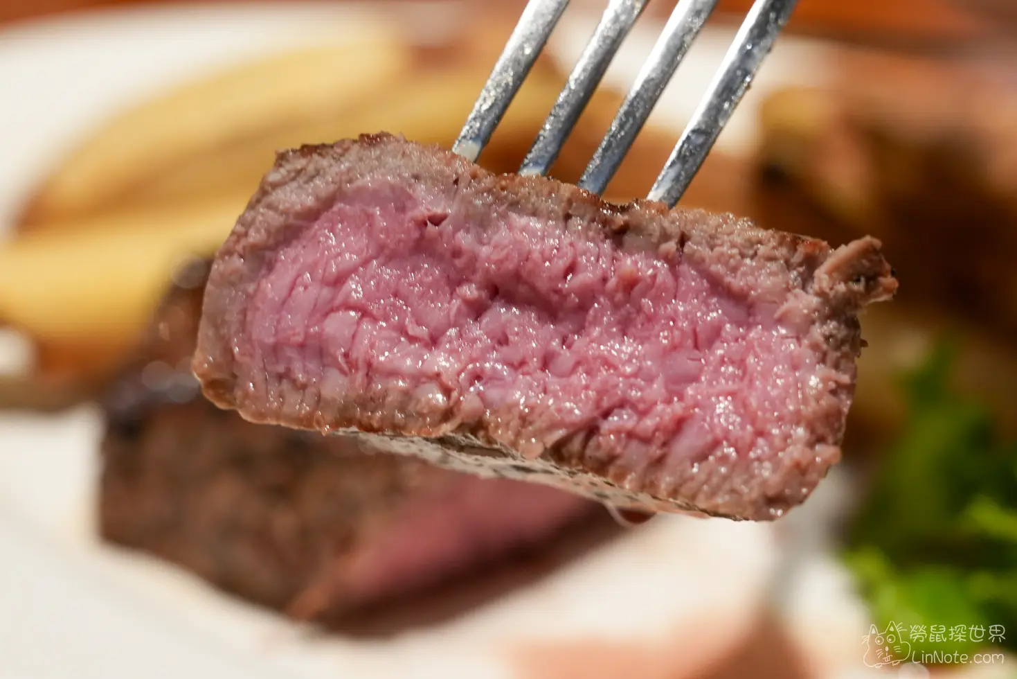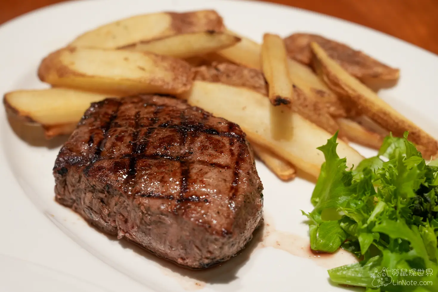 這塊牛排厚度很夠!一入口就是濃濃的炭火香味。肉質是屬於整塊瘦肉的類型,幾乎沒有油脂,但吃起來很嫩、牛肉本身的甜味很明顯。