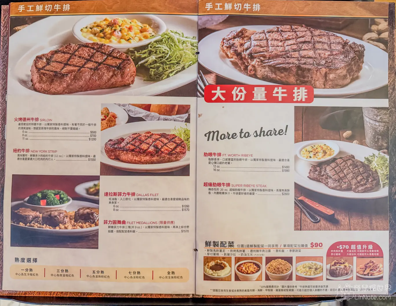 牛肉蔬菜湯和無限續加的肉桂麵包絕對是亮點。至於牛排,如果你喜歡吃瘦肉、追求厚實口感,選 火烤德州牛排;如果你喜歡油脂香氣、追求軟嫩,那就選 肋眼牛排(但要接受邊緣可能稍乾)。