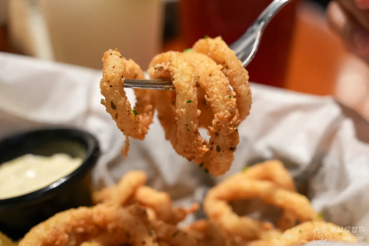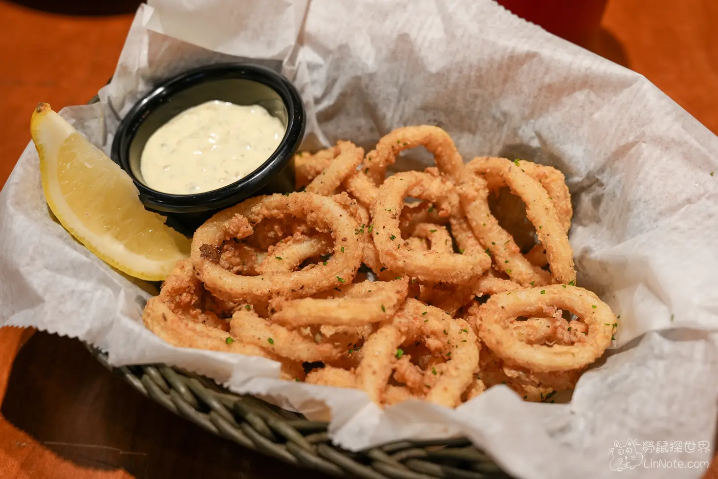 我們這次點了炸花枝圈,外皮炸得很酥,花枝本身的口感很讚、很有彈性。 要注意的是花枝本身沒什麼調味,主要是吃外層麵衣的鹹味。建議一定要沾附贈的塔塔醬,酸酸甜甜的非常解膩又涮嘴!但整體調味偏鹹,是一道絕對需要配飲料的下酒菜。
