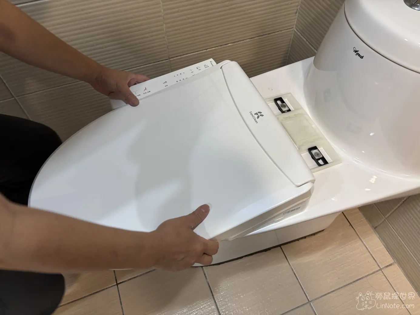 把免治馬桶的固定座鎖好後,只要把免治馬桶滑進去就裝好了,底部需要清潔也只要滑出就好,非常簡單。