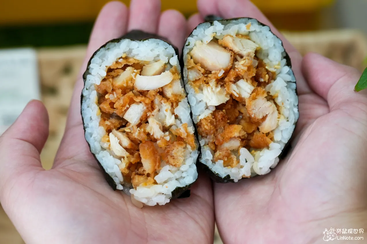 飯糰一切開真的太令人驚訝啦,他的餡料居然比飯還要多兩倍,非常飽滿,看了心情超好。炸雞塊味道挺香的,有著醬油的香氣,吃起來酥酥脆脆的,而且每一口都是滿滿的料!
