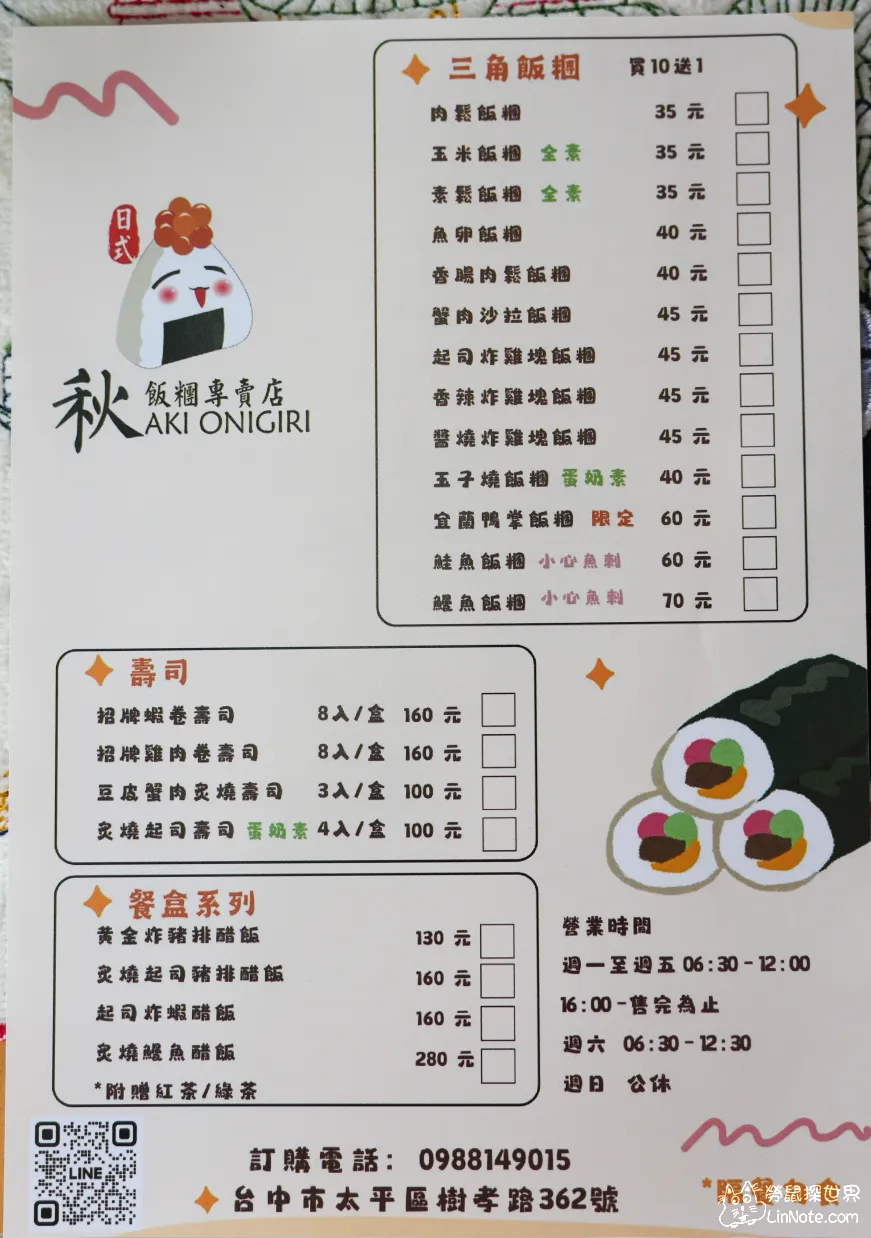 秋飯糰位在台中太平區的樹孝路上,是一間專做外帶的的飯糰店,雖然只是小攤商,但老闆很用心在佈置攤販上,處處可見小驚喜。
