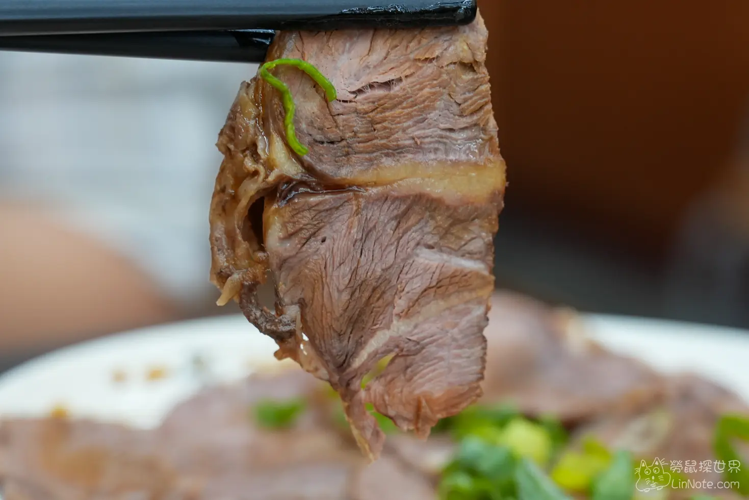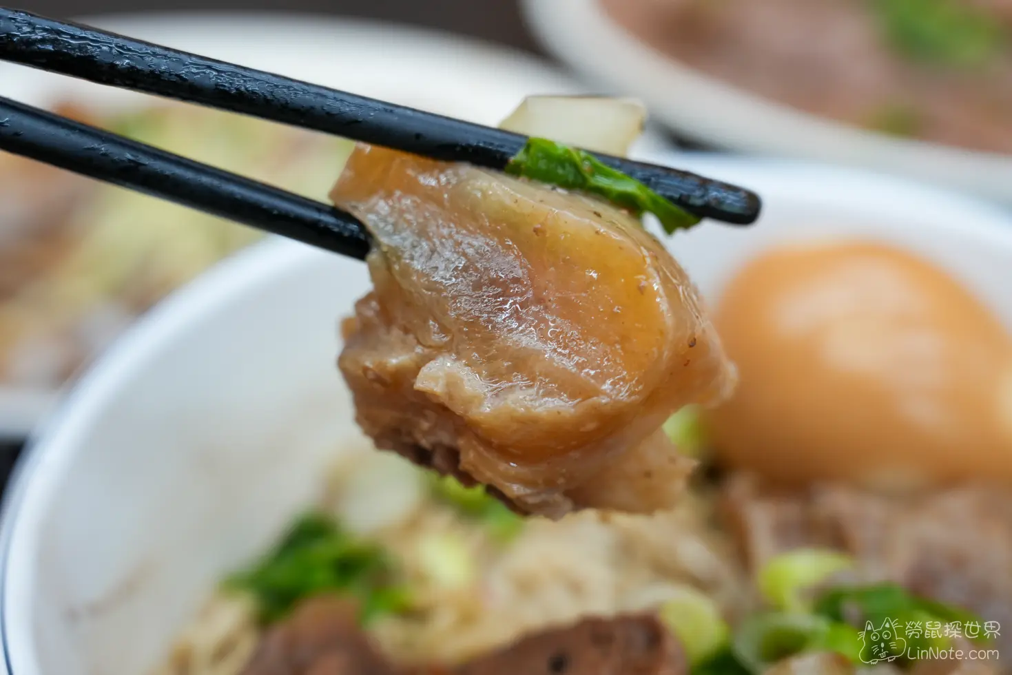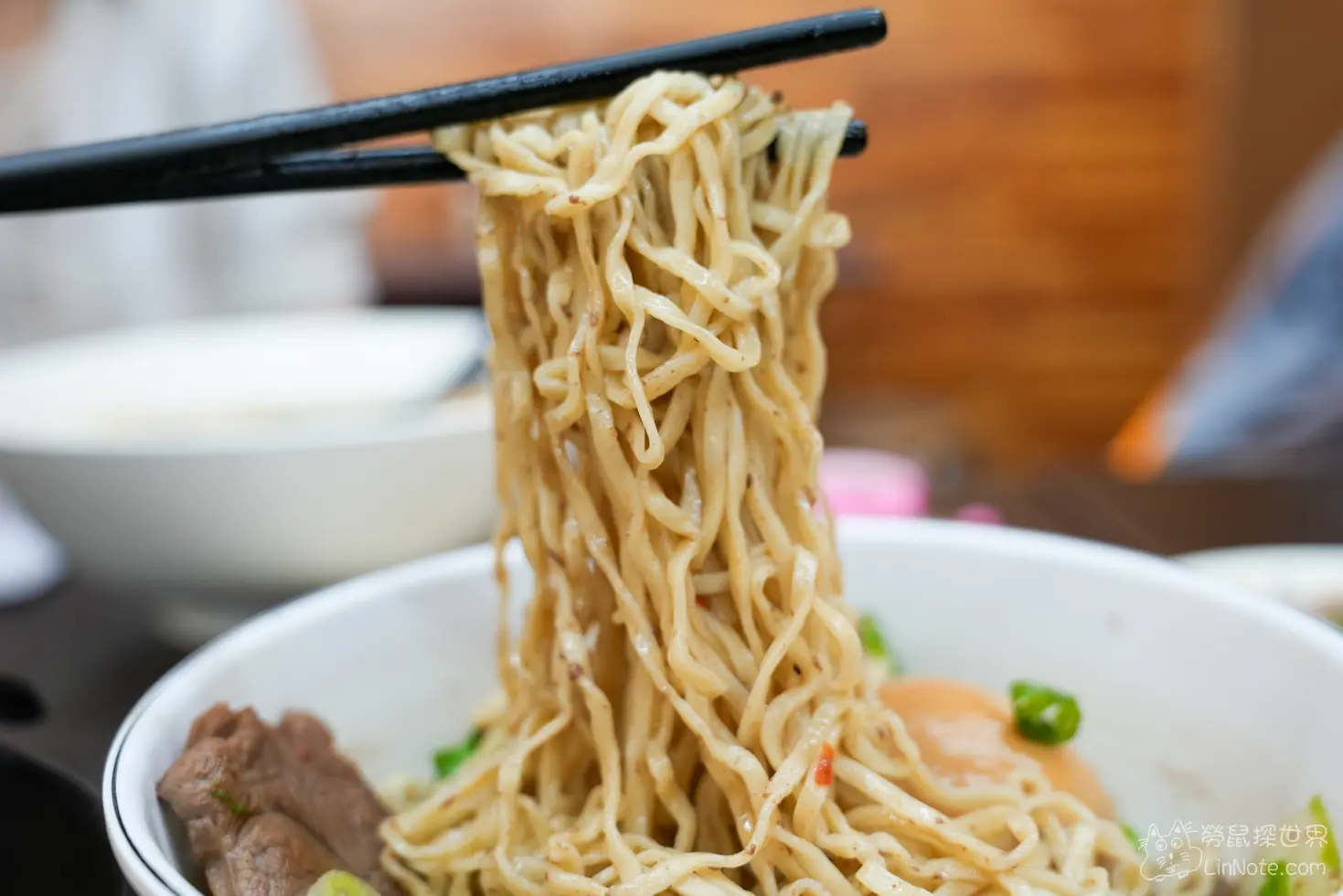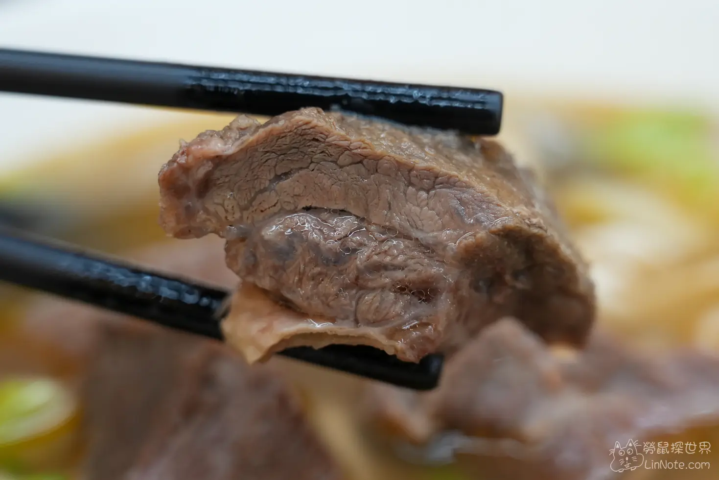 筋肉牛拌麵裡有三大塊牛肉及牛筋,我必須說他的牛筋太令人驚艷了,牛筋可以感受到滷得非常久,輕輕一夾起可以感受到膠質的彈性,滷到化開但又保有牛筋微微的口感,真的非常厲害。不過相對牛筋來說,牛肉就比較硬一點點,但也是軟嫩,風味依舊濃郁好吃。