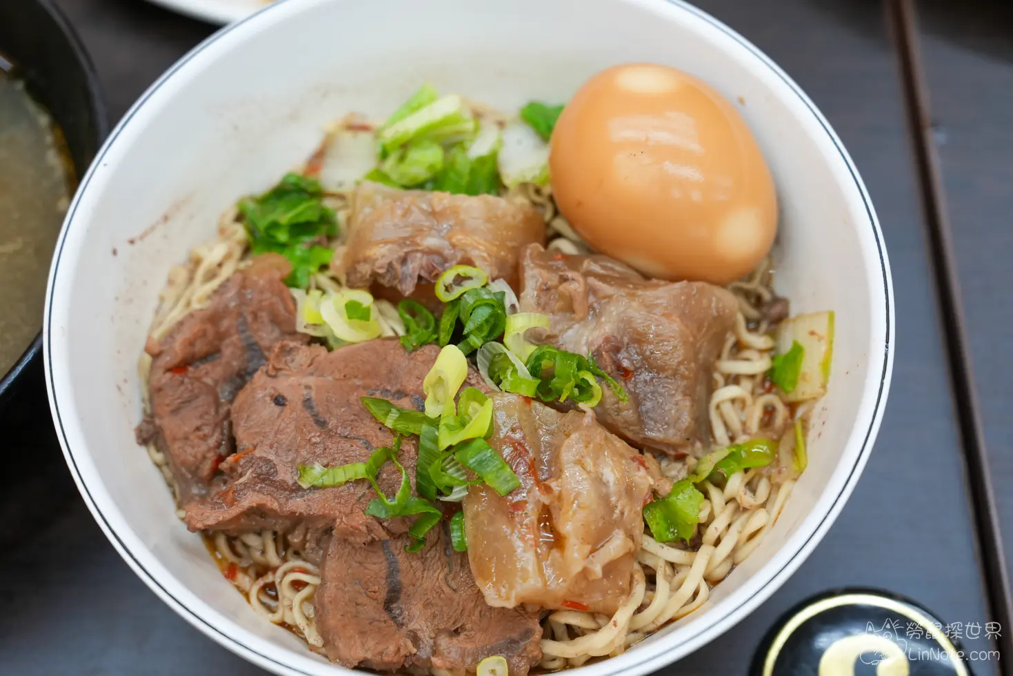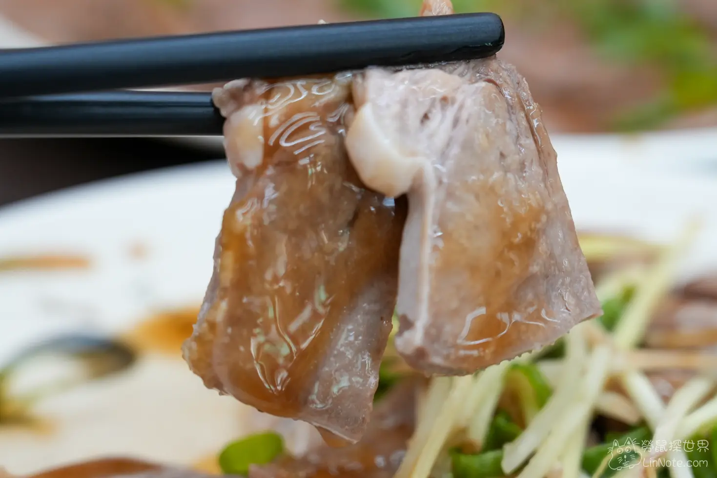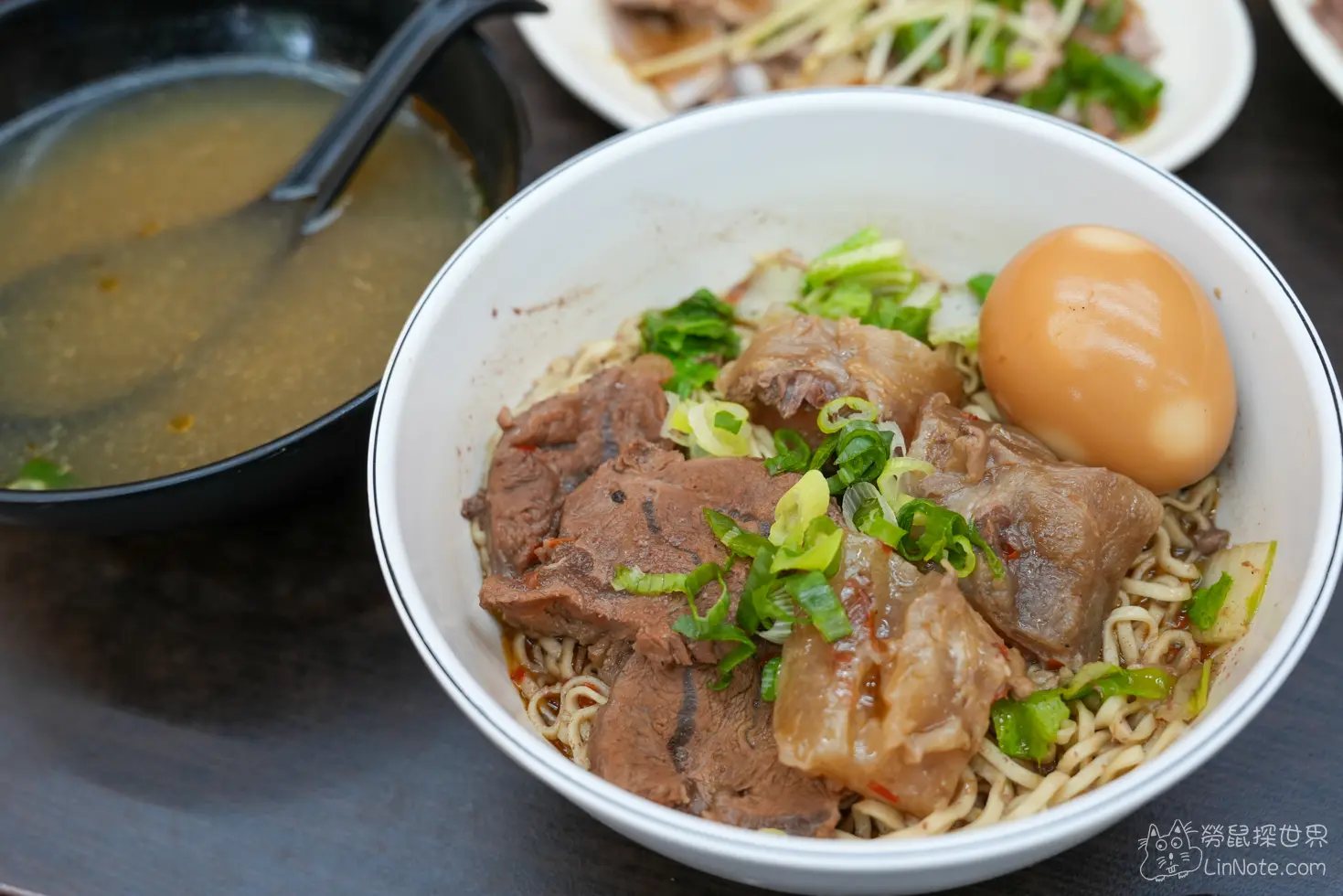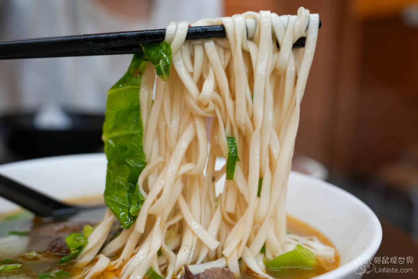 筋肉牛拌麵裡有三大塊牛肉及牛筋,我必須說他的牛筋太令人驚艷了,牛筋可以感受到滷得非常久,輕輕一夾起可以感受到膠質的彈性,滷到化開但又保有牛筋微微的口感,真的非常厲害。不過相對牛筋來說,牛肉就比較硬一點點,但也是軟嫩,風味依舊濃郁好吃。