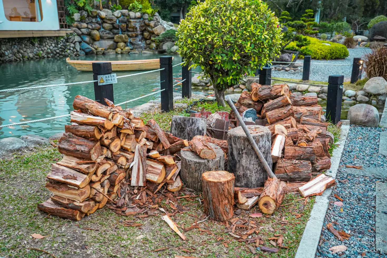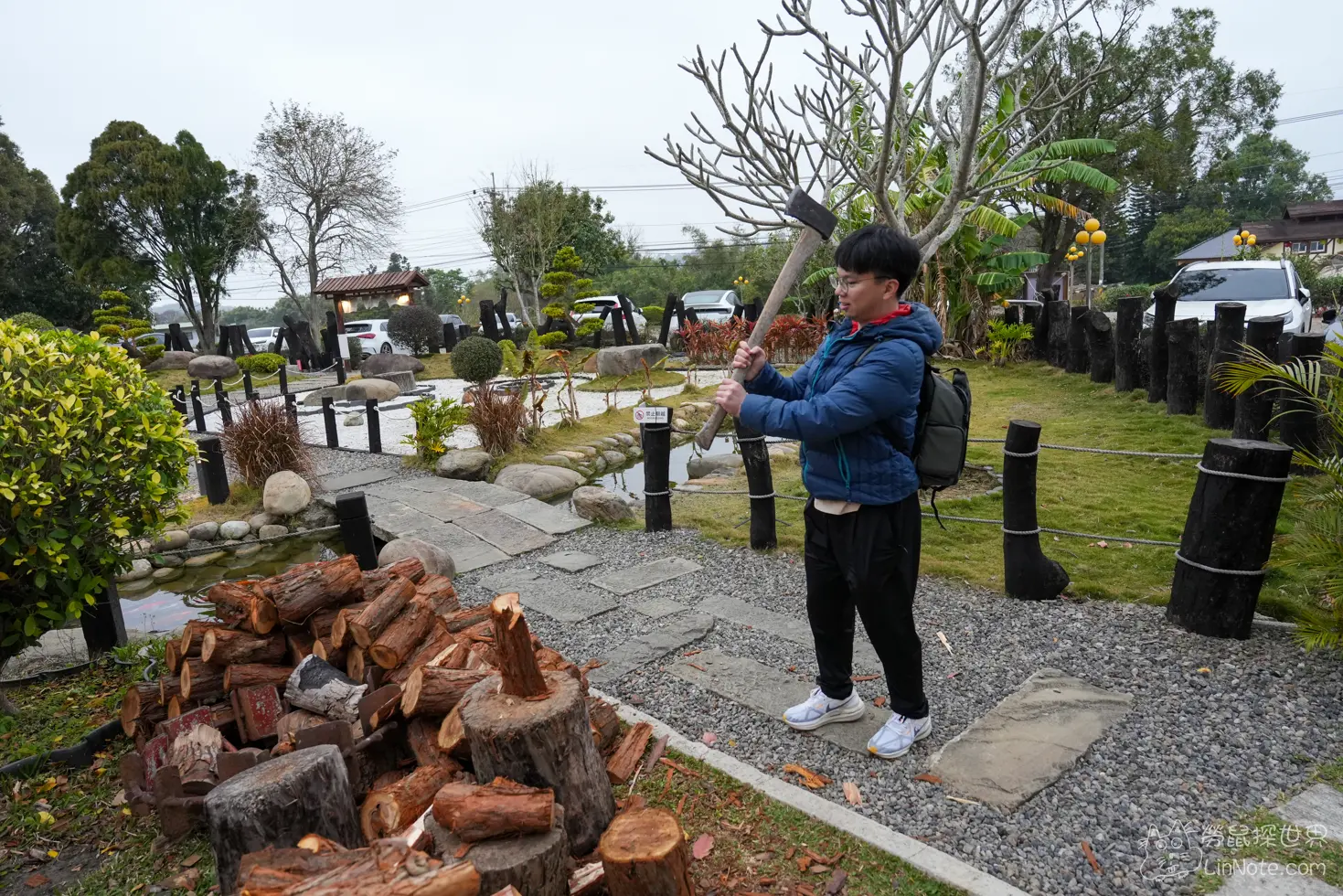 庭園還有一區砍柴專區,看著很多遊客都在那裡小試身手,我們也忍不住去體驗了一下,成功劈開木頭的那一刻超有成就感,但必須說,砍柴真的滿辛苦的,專業的不好當呀!不過斧頭真的又重又危險,拿取的時候一定要注意安全。