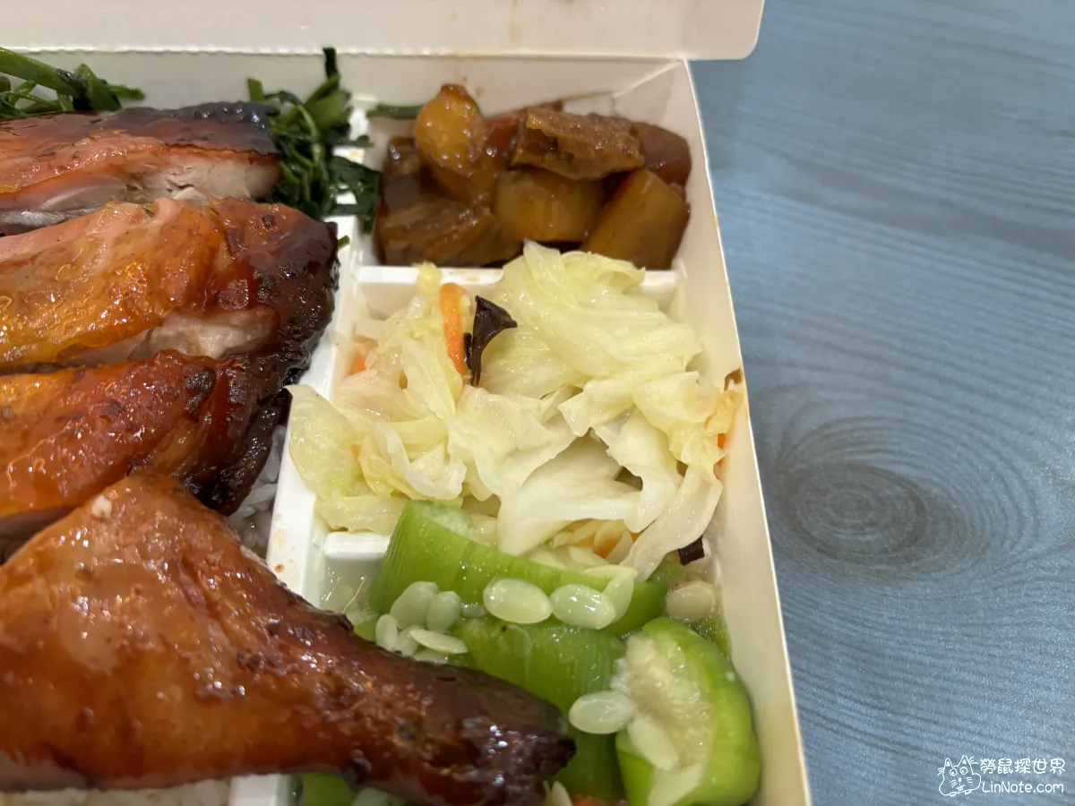 皇品燒臘的燒臘肉類都滿不錯的,可能醬汁會稍微偏甜,但味道都非常足,而且配菜的選擇非常多樣,10道菜有時候都會讓我出現選擇障礙,而且有時配菜也有肉類的選擇,我好幾次區都有看到炸柳葉魚,真的還不錯。