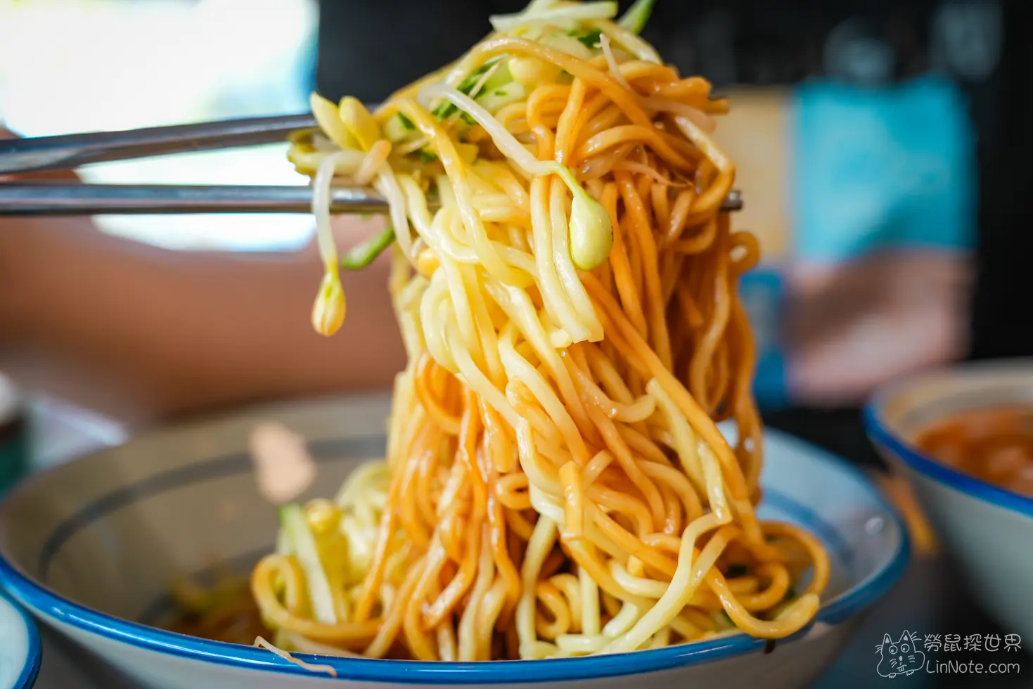 油麵以類似醬油膏的醬汁為底,鹹香之外帶點甜味,上面灑著炸過的油蔥,可以吃到酥香味,芽菜跟小黃瓜讓口感更豐富,配著一顆大顆貢丸,緊實有彈性滿好吃的。