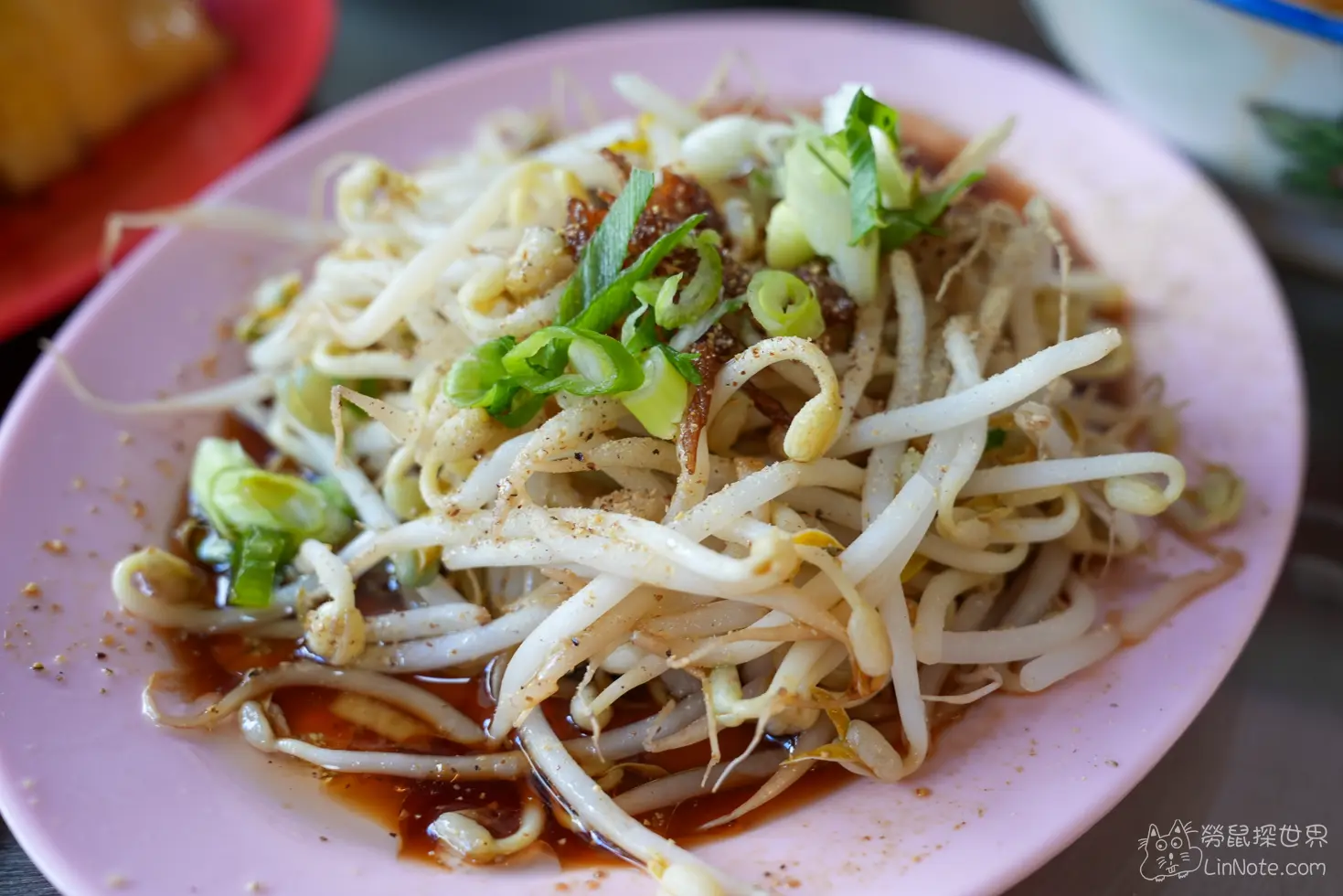 淡淡醬油搭上川燙好的豆芽菜,豆芽菜肥肥短短且脆脆嫩嫩的,上面灑著胡椒鹽,調味算是清爽。