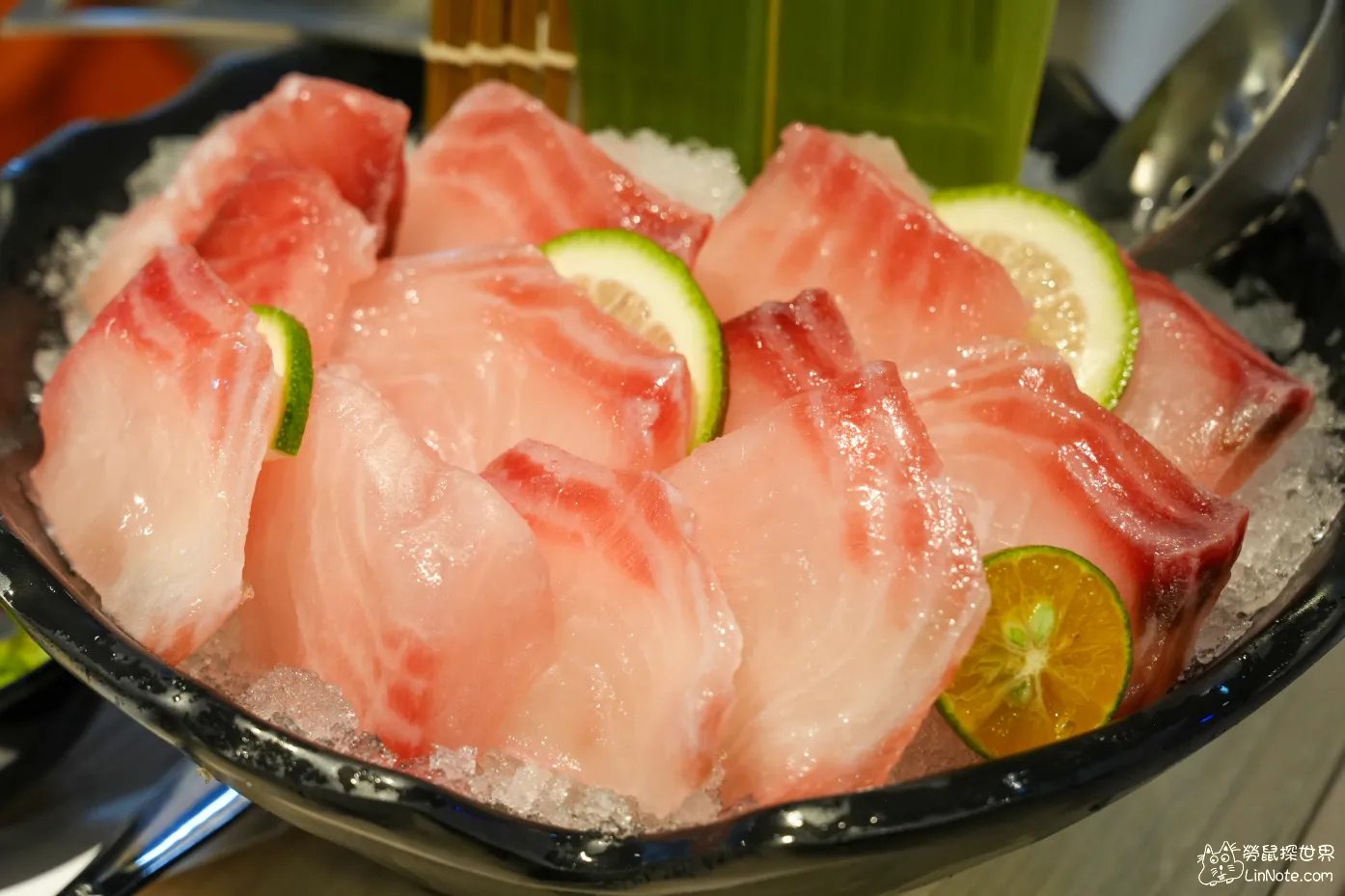 鯛魚上來其實還滿吸引人注目的,用一個很大的碗,下面裝著許多的碎冰,以及用檸檬跟金佶陪襯,一上來就覺得滿厲害的。