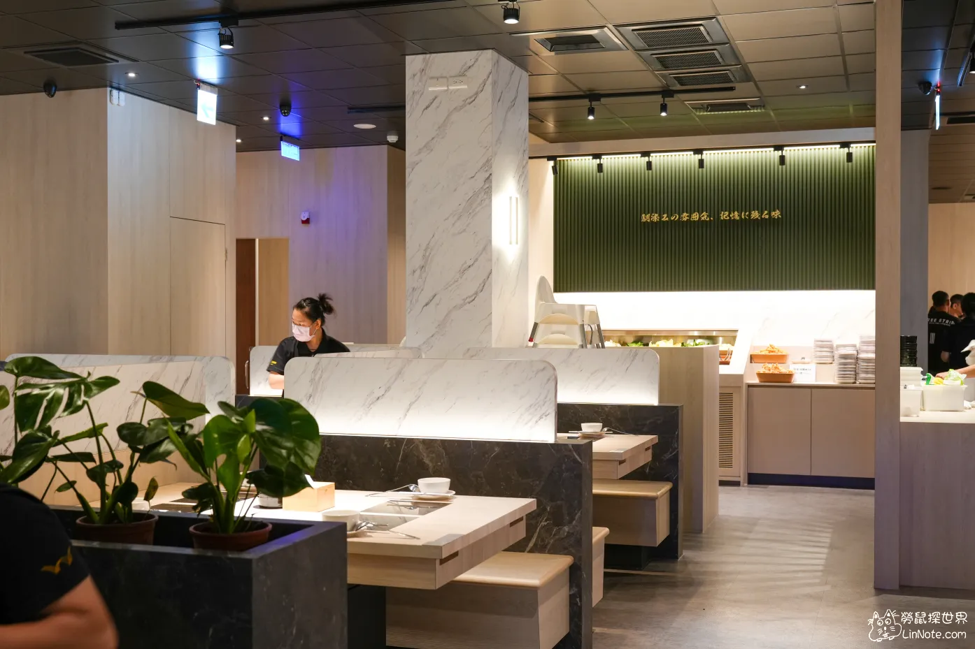 內部的裝潢走的是現代極簡,白色的桌椅線條整潔,地板是柔和的灰色,與整體的中性色調空間相襯,牆上的紋理牆板也為用餐空間增添了一抹色彩。
