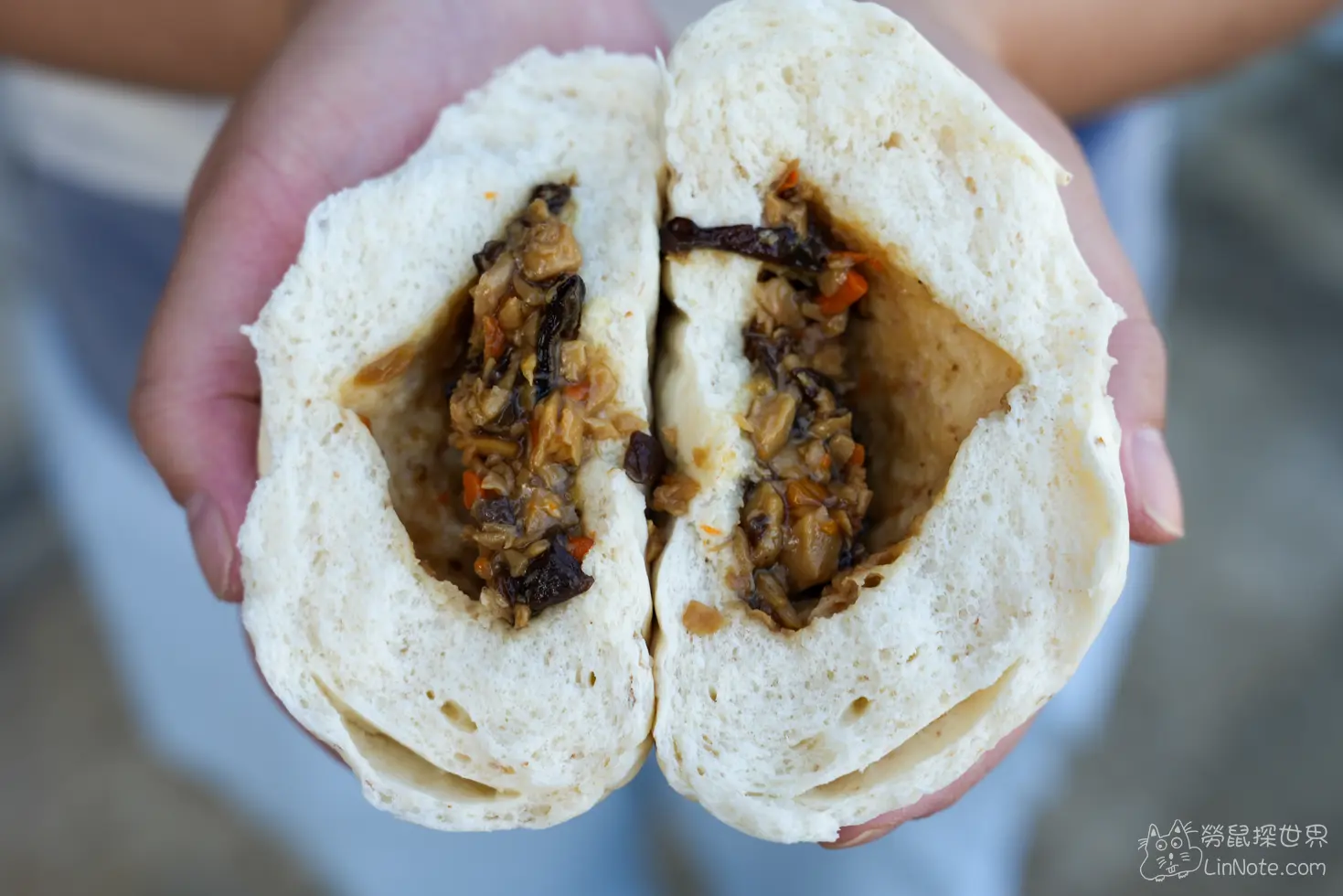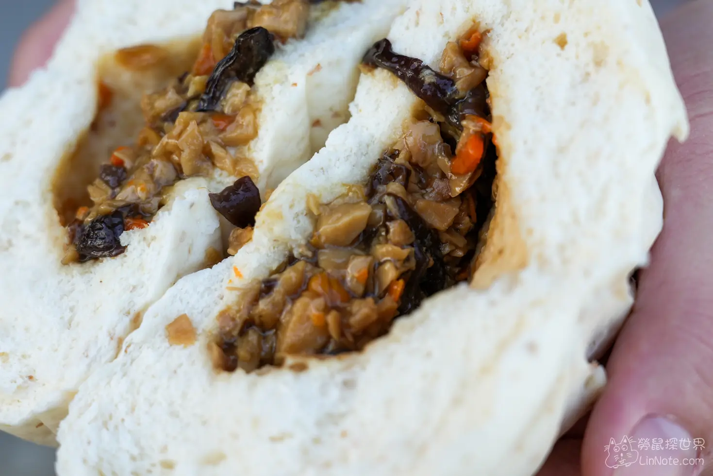 杏鮑菇包其實這就是菜包的升級版,內含杏鮑菇、木耳、紅蘿蔔等食材。多了杏鮑菇的口感後,嚼勁更好,整體調味香氣十足,完全不輸給其他名店的菜包。