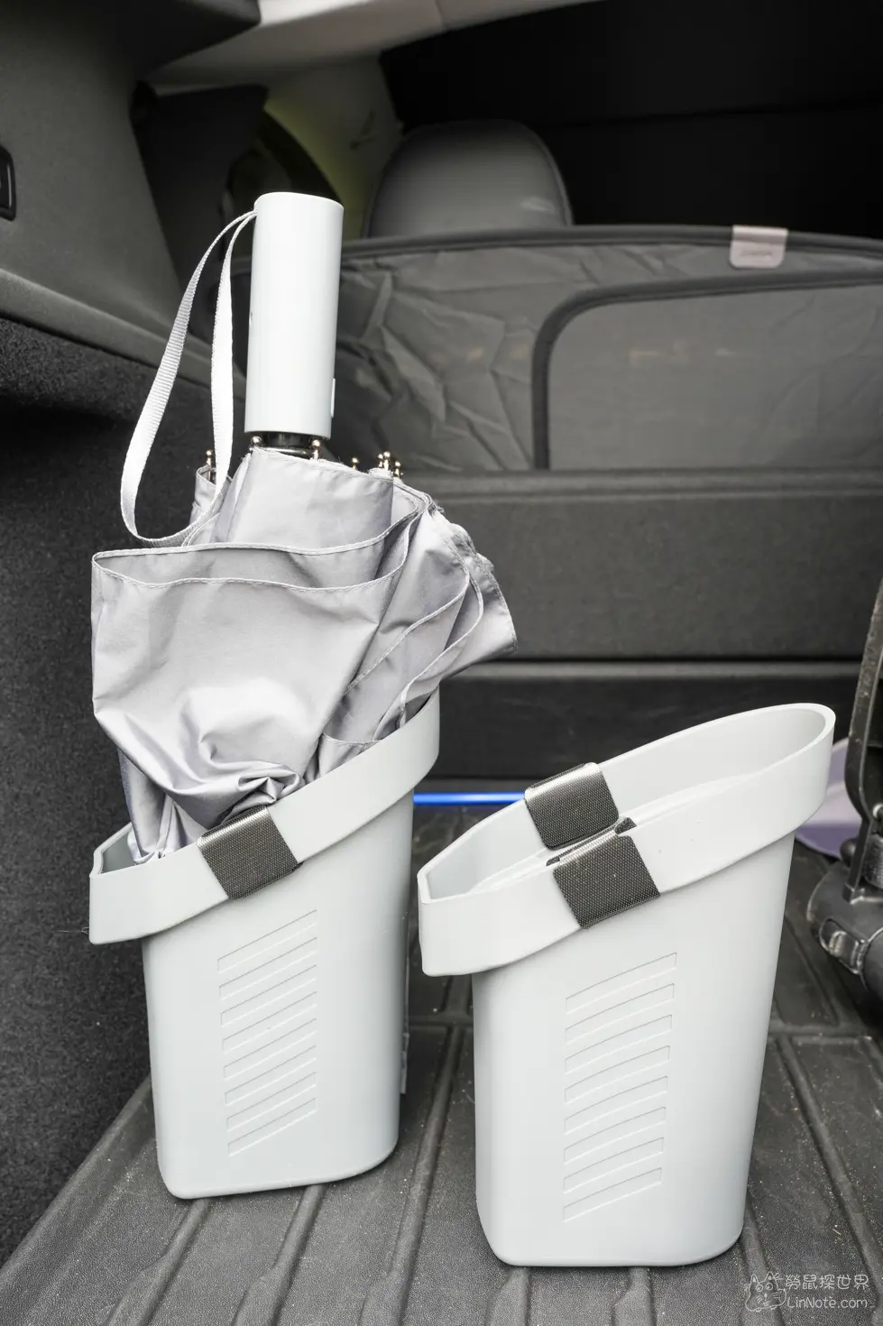 最後要介紹的是這個車內萬用收納桶。它可以放在車門兩側的置物槽,尺寸剛剛好,平常可以當垃圾桶,或者拿來放摺疊傘(濕掉也不怕弄髒車門)。