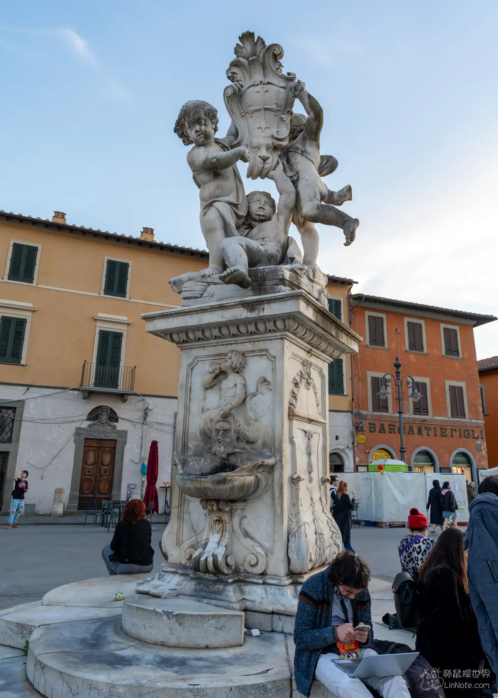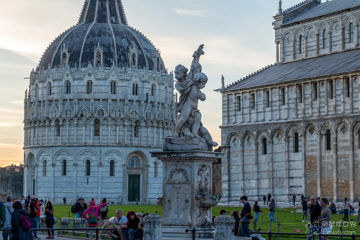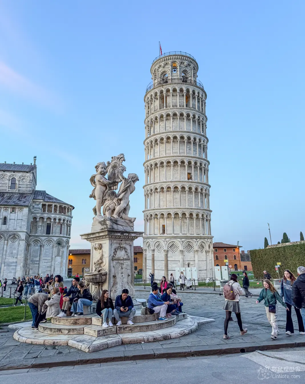 在狂拍斜塔之餘,別忘了轉頭看看廣場邊緣這座建於 18 世紀的 『小天使噴泉 (Fontana dei Putti)』。三個可愛的小天使扛著比薩市徽,這可是廣場上少見的巴洛克風格作品!而且這裡目標顯眼,如果跟旅伴分頭行動,約在這裡集合最方便。