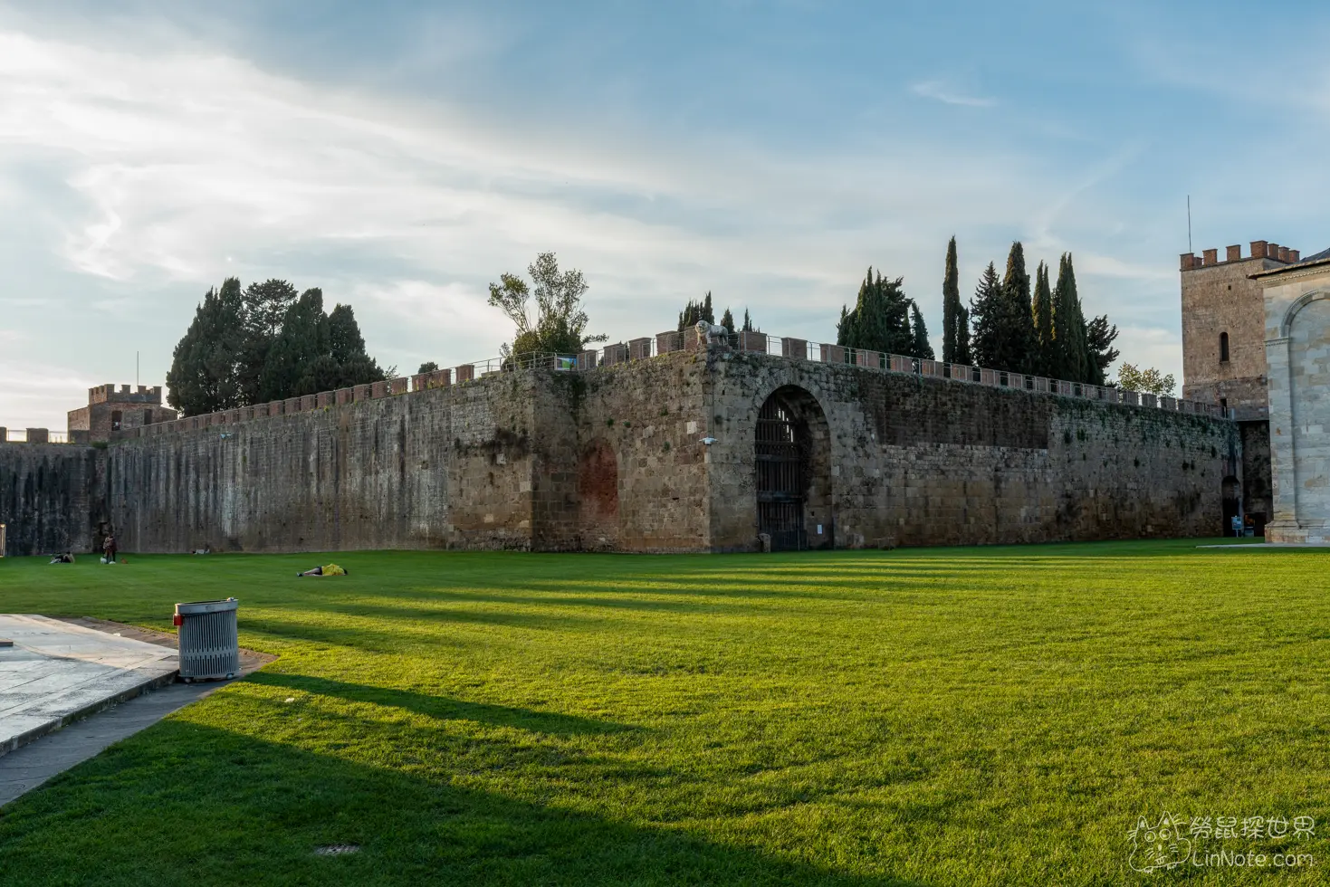 始建於 1155 年。那時候比薩是地中海的海上霸主(與威尼斯齊名),為了保護城市的財富和教堂,他們花了好幾個世紀蓋了這圈長達 3 公里、高約 11 公尺的防禦工事,它是義大利現存最完整的古城牆之一。