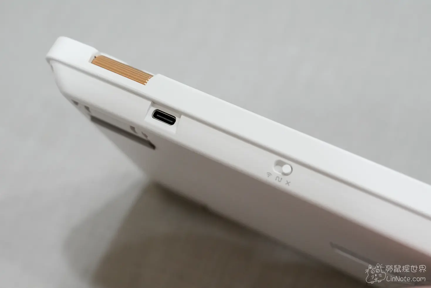 前面的部分有 Type C 接口以及模式切換鍵,從右邊數過來分別是關機、有線以及無線模式,無線模式包含藍芽以及 2.4G。