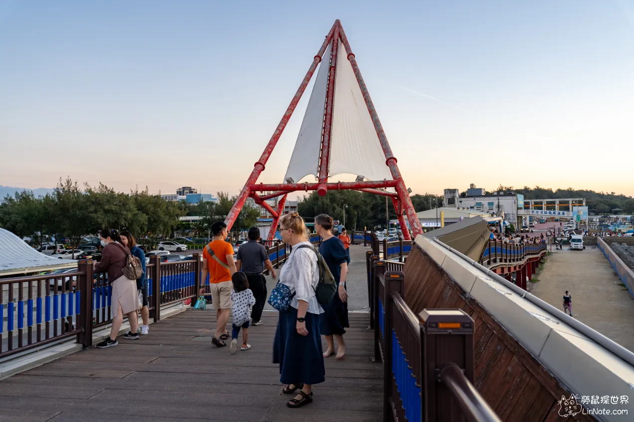 一到漁港,就會看到最引人注目的帆船造型景觀橋,於2008年建成,是一座白色風帆造型的橋,堅固的鋼骨結構下,你可以站在上面欣賞海天一色的景緻。晚上這裡的照明燈光點亮了整個漁港,晚上的時候來散步也是滿迷人的。