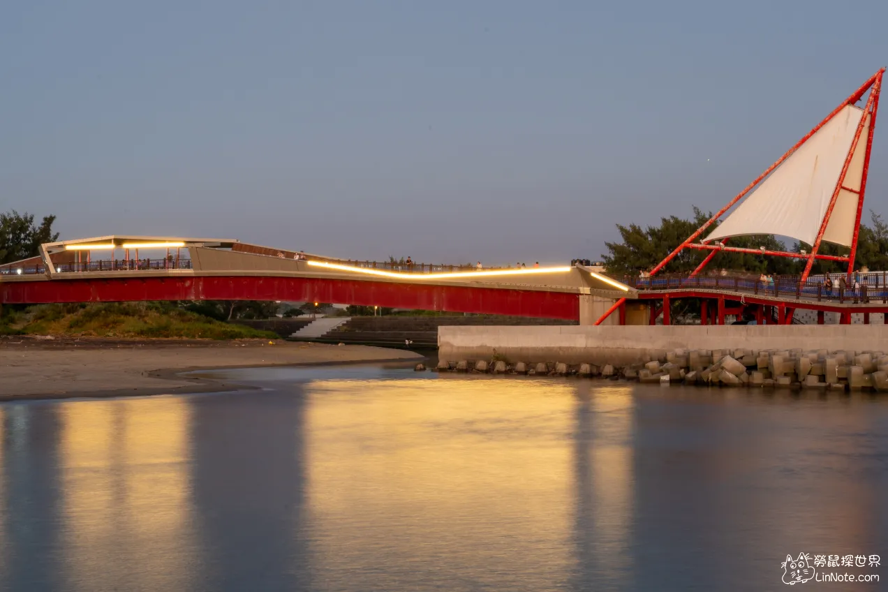 竹南龍鳳漁港最具代表性的地標,就是這座造型如同白色風帆的觀景橋。站上橋面,可將整片無垠海景收進眼簾,尤其夕陽時分,彩霞映照在水面,讓整個漁港渲染出浪漫氣息。到了夜晚,觀景橋及周邊景觀平臺燈光璀璨,非常適合情侶來場海風伴隨的約會散步,也十分適宜親子來此騎單車、吹海風,是苗栗竹南不可錯過的免費景點之一。