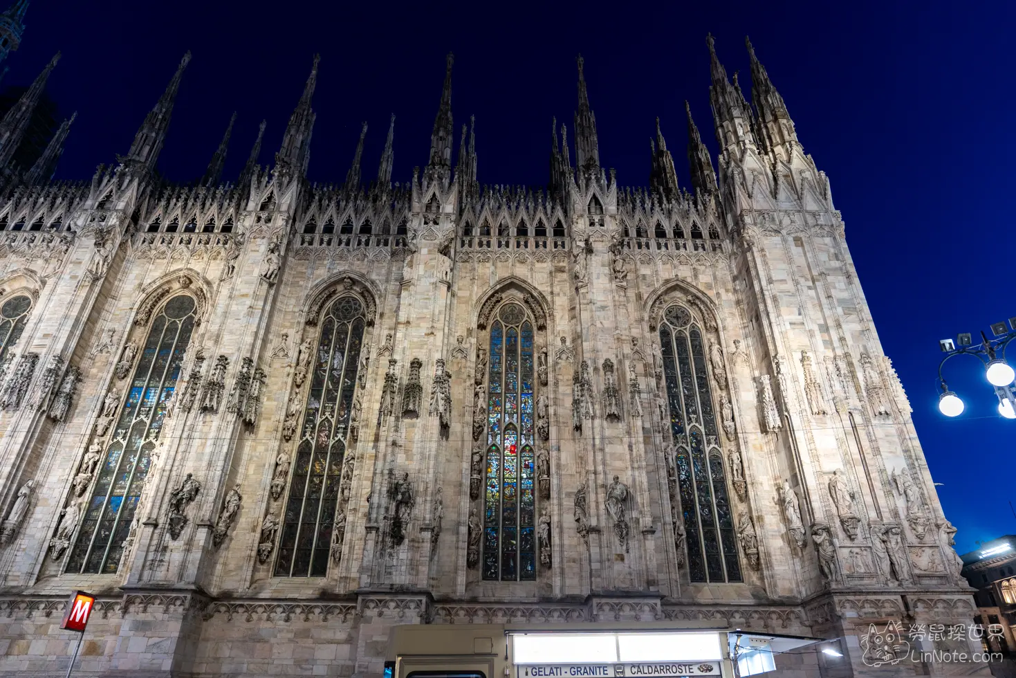 仔細看照片左側中上方、教堂主體最高的那根尖塔頂端,有一個散發著金黃色光芒的亮點。那是米蘭的守護象徵——純銅鍍金的聖母瑪利亞雕像。在夜晚的燈光照射下,她顯得特別耀眼。