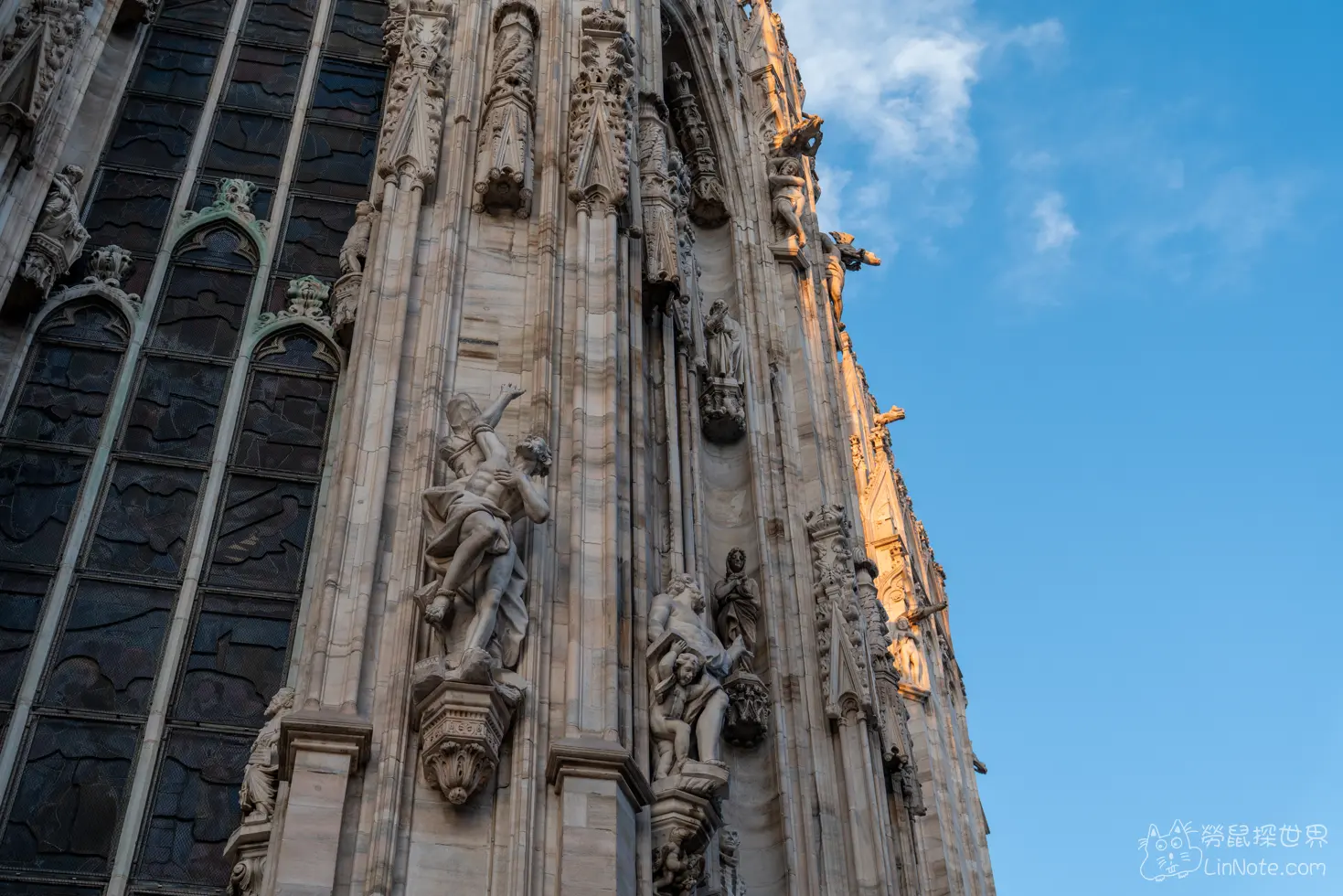 米蘭大教堂以其數量龐大的雕像聞名於世,整座教堂內外有多達 3,400 多座雕像(包含 135 座尖塔上的雕像)。照片中你可以看到外牆柱子上層層疊疊、神態各異的人物雕像,這些通常是聖人、先知、殉道者或聖經故事中的人物。他們的姿態非常生動,充滿了戲劇張力。