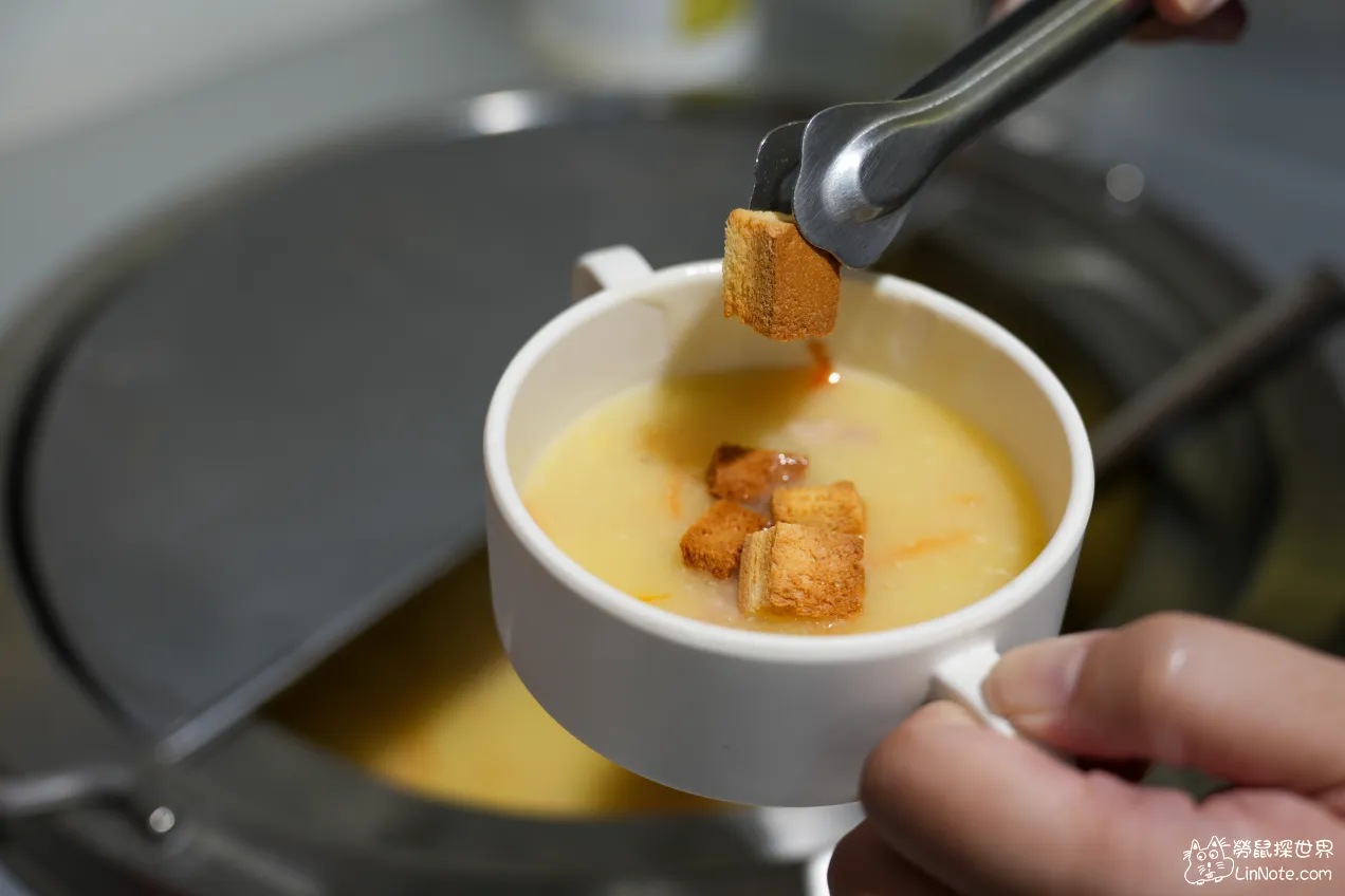 牛排店標配的玉米濃湯奶油味非常濃郁,每一口都是滿滿的奶油香,搭配旁邊提供的酥脆麵包丁,風味更升級。