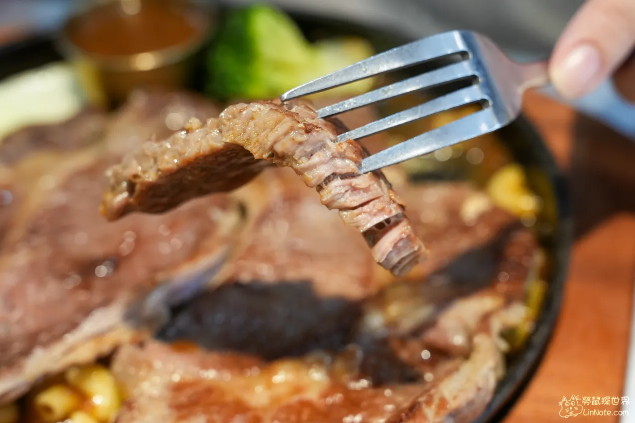 頂級熟成肋眼的牛肉非常扎實,咬起來特別有嚼勁,而且牛肉的風味非常足,比較適合喜歡牛味重一點的人,整塊肋眼充滿肉汁,搭配洋蔥的辛香提味,整體味道更有層次。