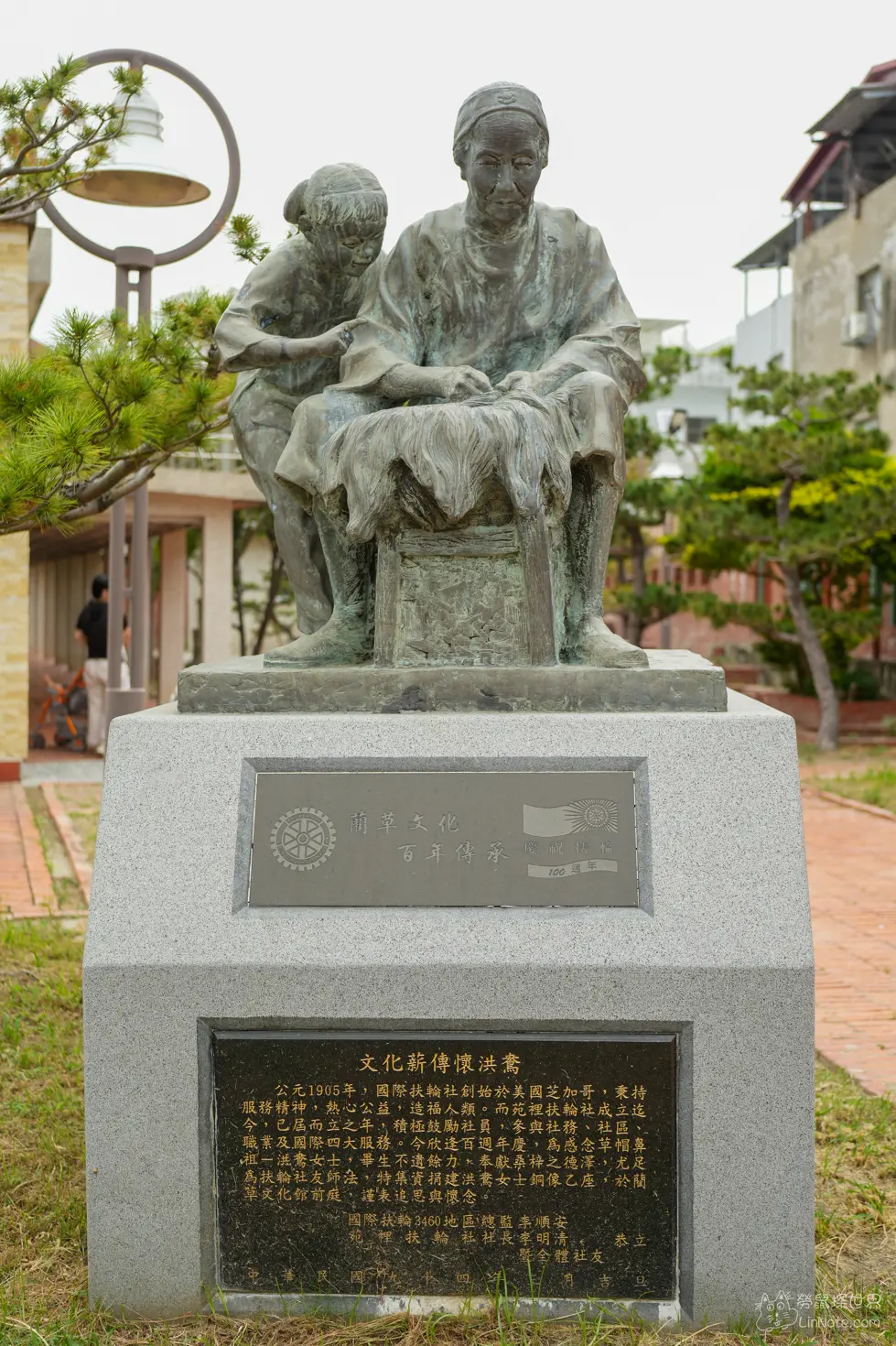 洪鴦女士的雕像,是由國際扶輪社捐贈的雕像,洪鴦是大甲草帽的催生者,在日治時期帶動苑裡以及大甲地區的編織業,非常受到日本人的歡迎。