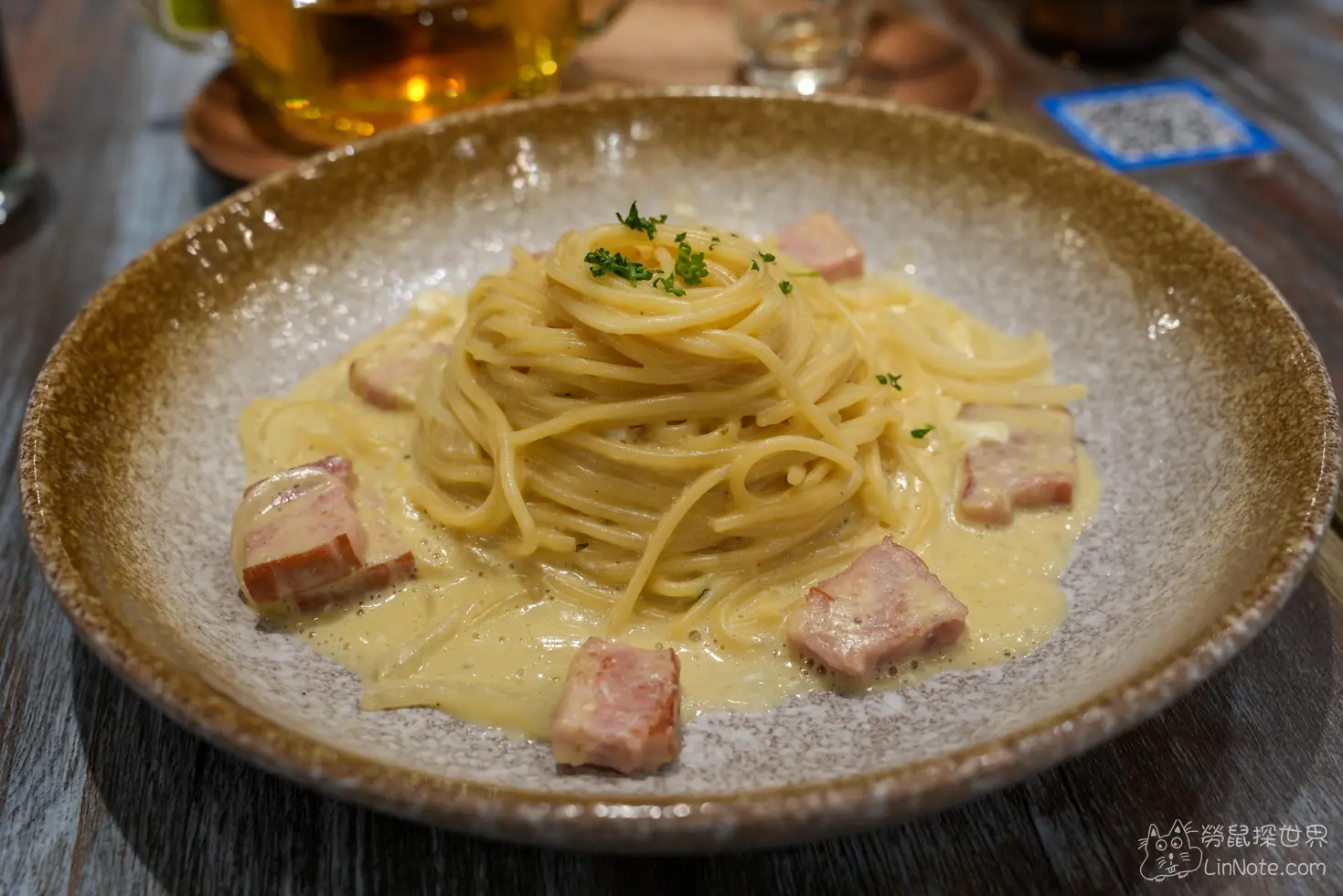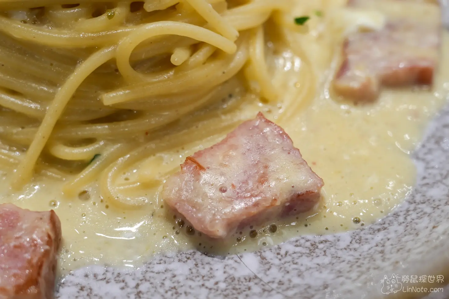主食的部分,我們嘗試了奶油培根義大利麵。這道的奶油白醬非常濃郁,汁水收得恰到好處,香氣十足。