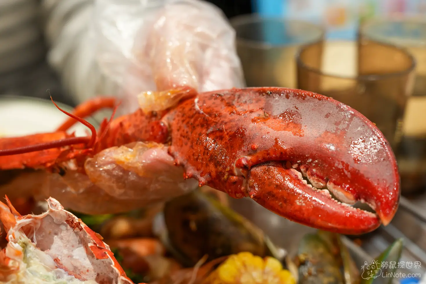 再來就是重頭戲——手抓海鮮盤配波士頓龍蝦!上菜前,服務人員會先把活生生的波士頓龍蝦送到桌邊讓我們拍照。雖然龍蝦在那時沒什麼大動作,但仔細觀察可以發現牠還在呼吸、旁邊會冒泡泡,新鮮度直接看得見。