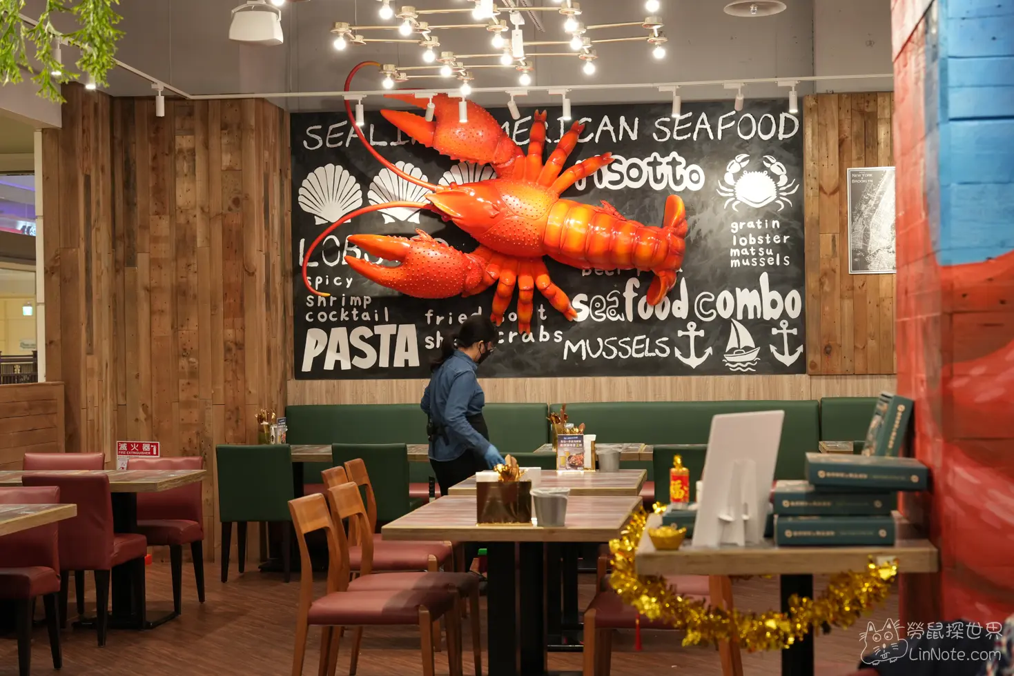 一進到Sealine海岸線台中麗寶店,第一印象就是環境非常明亮舒適。店裝風格走的是一種「美式海港風」,最吸睛的絕對是牆面上那隻栩栩如生的巨大龍蝦和章魚彩繪,這是由台灣壁畫家謝松志老師創作的3D打卡牆,拍照效果真的超級好!