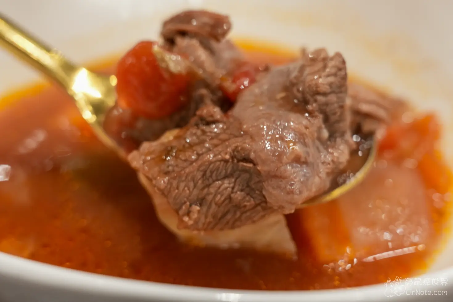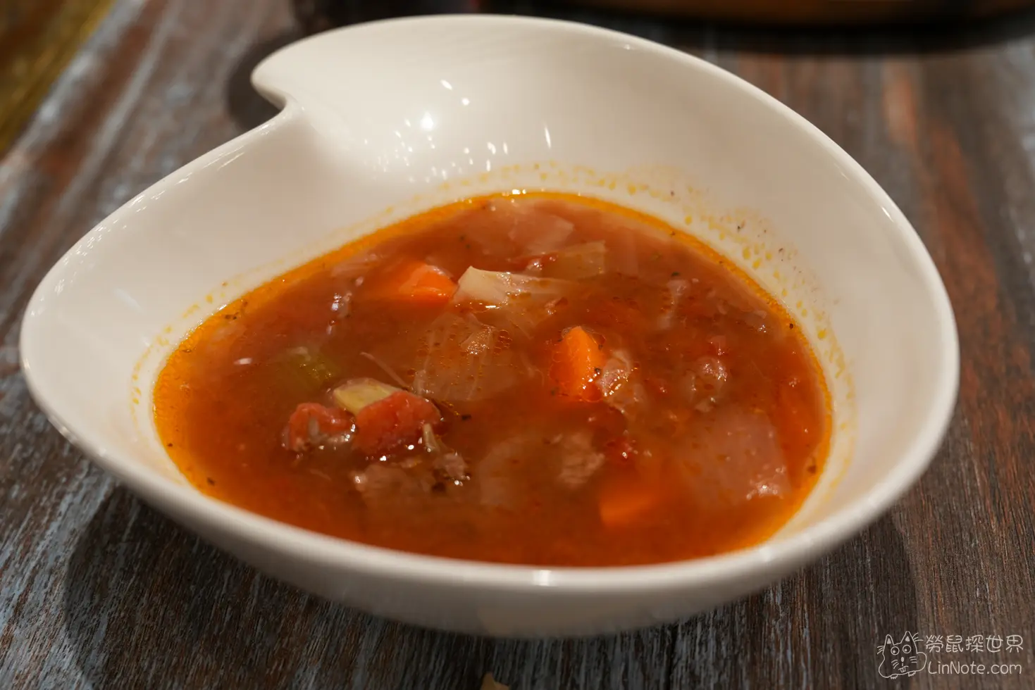 首先是開胃的羅宋湯。我覺得這款羅宋湯表現非常經典,酸味很夠且帶點微甜,裡面的配料給得很大方,喝起來非常開胃,暖暖的一碗瞬間喚醒味蕾。