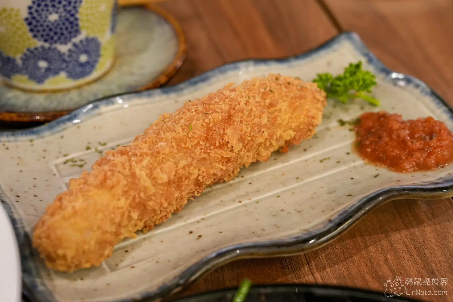 明太子起司條是用一整條起司酥炸後,再沾上一旁的明太子醬,外表酥脆,一口咬還會拉絲,最後沾上鹹香的明太子,真的是很有層次的一道菜。