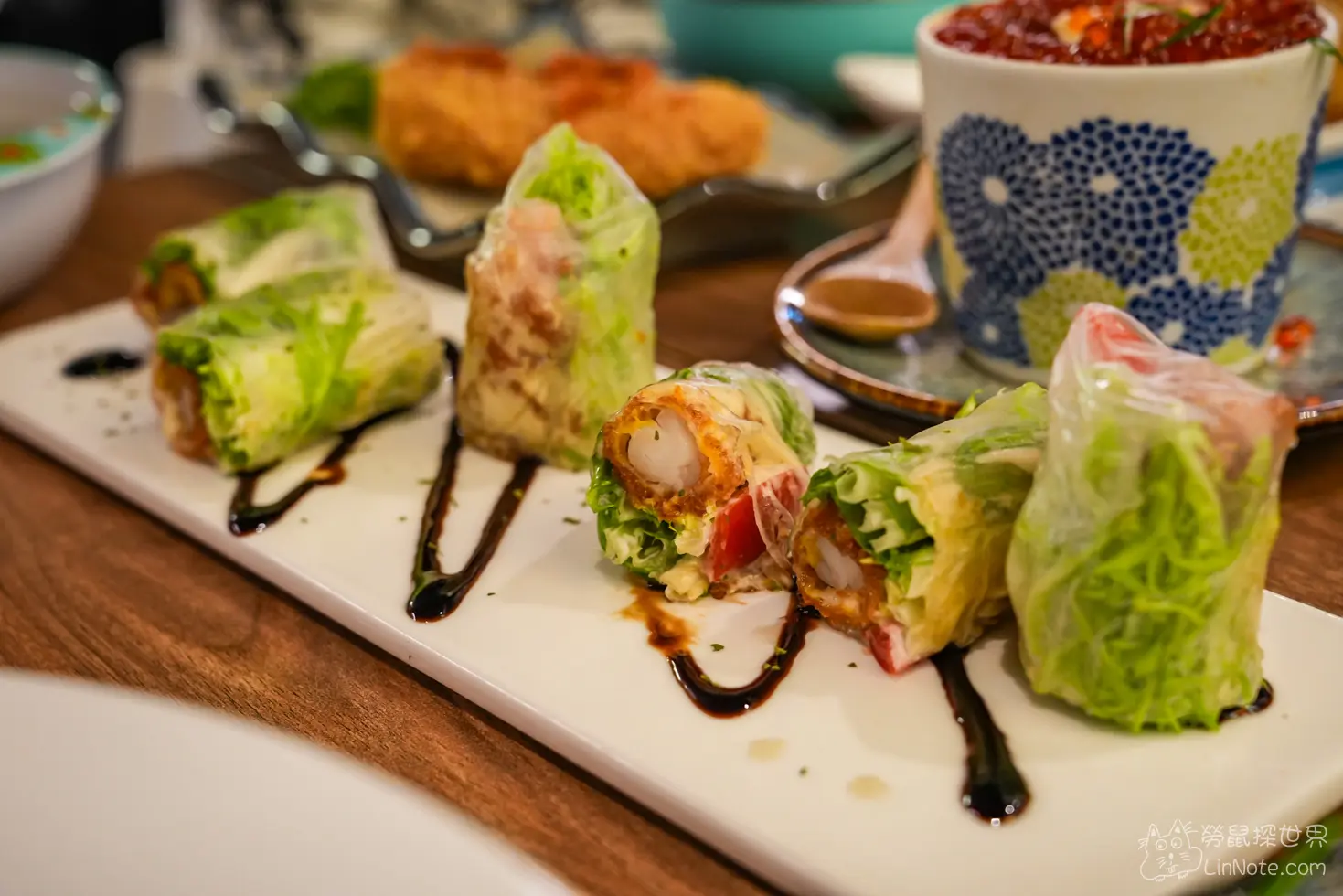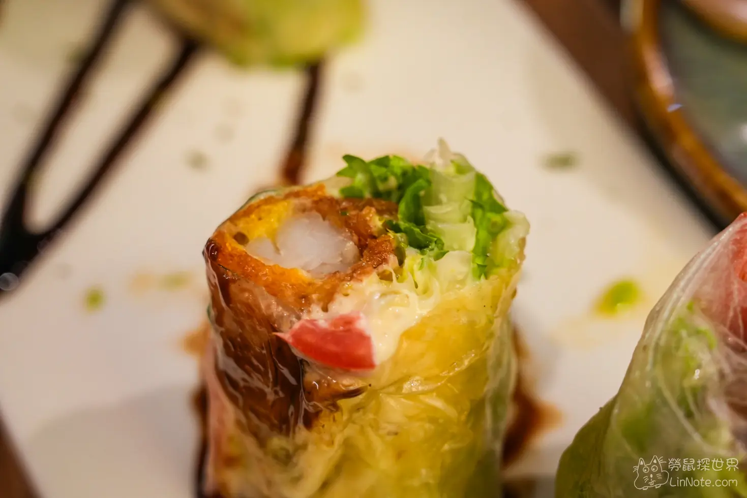 春捲的皮很薄,裡面有蝦子跟蔬菜搭起來非常清爽,可以吃到蝦子的鮮甜清爽又比較沒有負擔,而且他的炸蝦的皮很脆,並沒有因為包在春捲裡面而失去炸蝦脆皮的感覺,最後配上酸香濃郁的巴薩米克醋,增添風味層次。