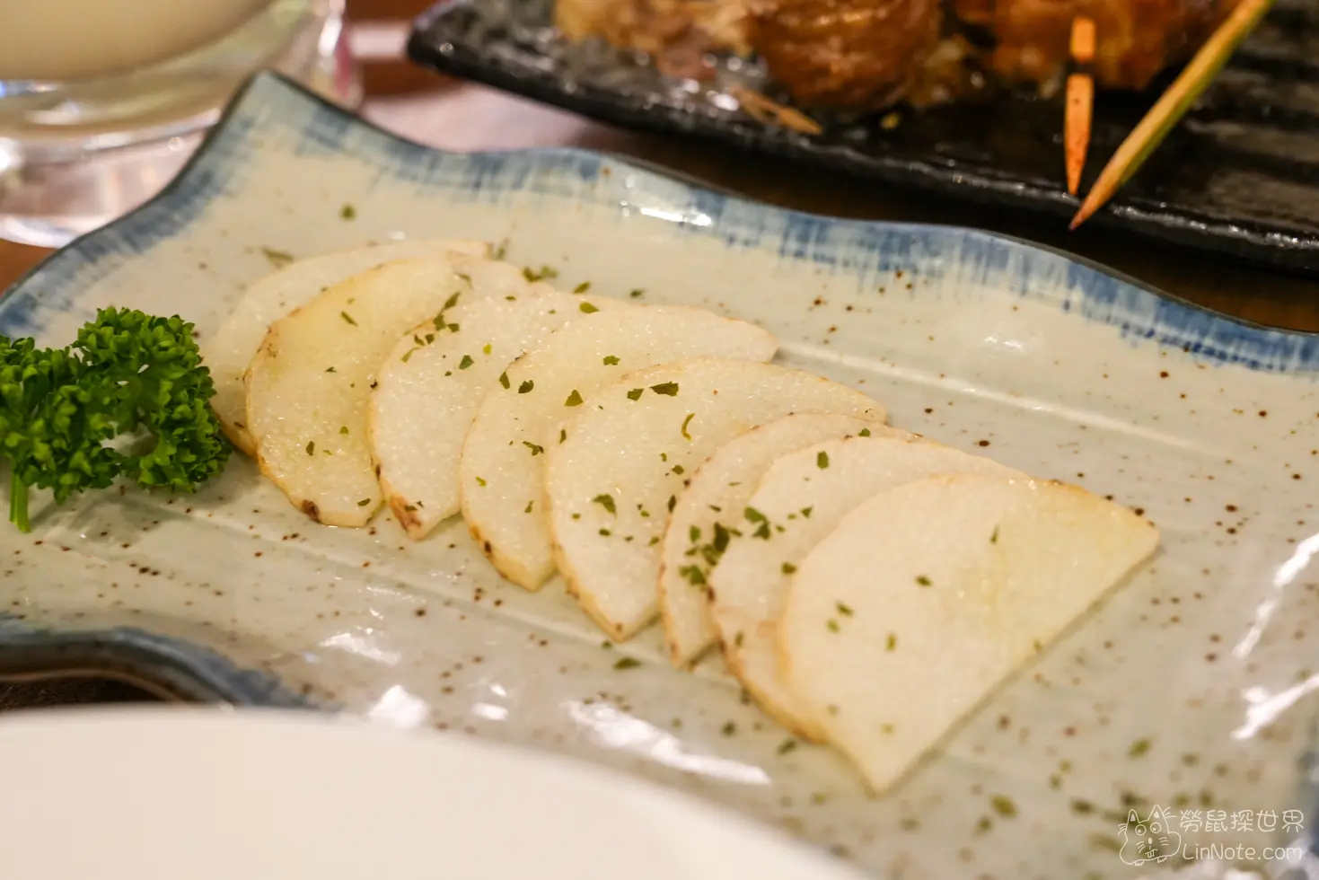 烤山藥切成薄片後烘烤,外酥內脆,口感如洋芋片般酥香,配上一點點鹽突顯山藥本身的風味。